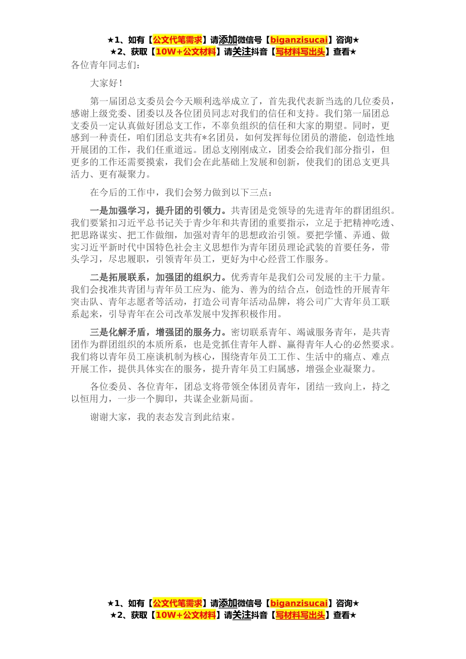 ★1、如有【公文代笔需求】请添加微信号【biganzisucai】咨询★★2、获取【10W+公文材料】请关注抖音【写材料写出头】查看★各位青年同志们:大家好!第一届团总支委员会今天顺利选举成立了,首先我代表新当选的几位委员,感谢上级党委、团委以及各位团员同志对我们的信任和支持。我们第一届团总支委员一定认真做好团总支工作,不辜负组织的信任和大家的期望。同时,更感到一种责任,咱们团总支共有*名团员,如何发挥每位团员的潜能,创造性地开展团的工作,我们任重道远。团总支刚刚成立,团委会给我们部分指引,但更多的工作还需要摸索,我们会在此基础上发展和创新,使我们的团总支更具活力、更有凝聚力。在今后的工作中,我们会努力做到以下三点:一是加强学习,提升团的引领力。共青团是党领导的先进青年的群...