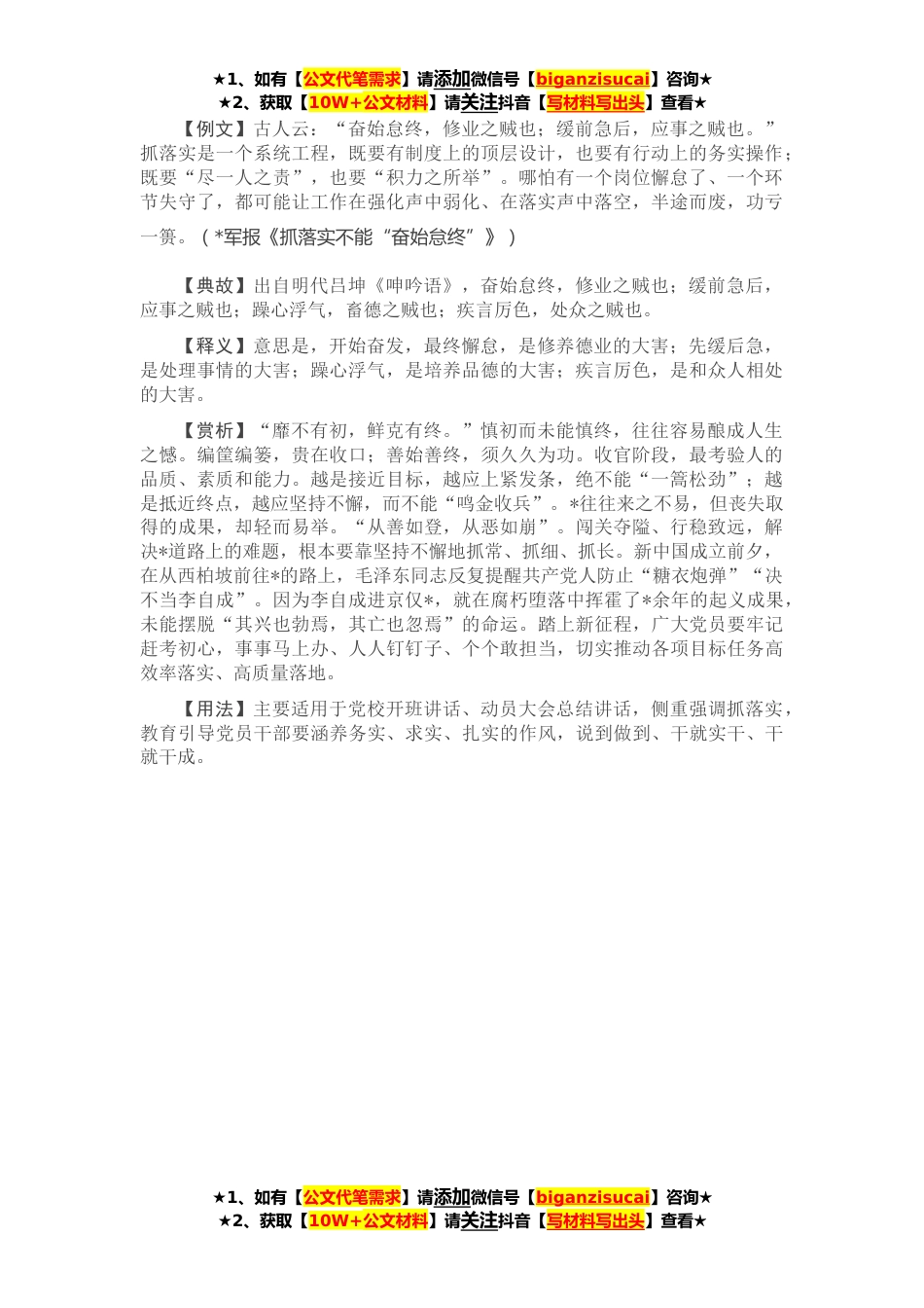 ★1、如有【公文代笔需求】请添加微信号【biganzisucai】咨询★★2、获取【10W+公文材料】请关注抖音【写材料写出头】查看★【例文】古人云:“奋始怠终,修业之贼也;缓前急后,应事之贼也。”抓落实是一个系统工程,既要有制度上的顶层设计,也要有行动上的务实操作;既要“尽一人之责”,也要“积力之所举”。哪怕有一个岗位懈怠了、一个环节失守了,都可能让工作在强化声中弱化、在落实声中落空,半途而废,功亏一篑。(*军报《抓落实不能“奋始怠终”》)【典故】出自明代吕坤《呻吟语》,奋始怠终,修业之贼也;缓前急后,应事之贼也;躁心浮气,畜德之贼也;疾言厉色,处众之贼也。【释义】意思是,开始奋发,最终懈怠,是修养德业的大害;先缓后急,是处理事情的大害;躁心浮气,是培养品德的大害;疾言厉...