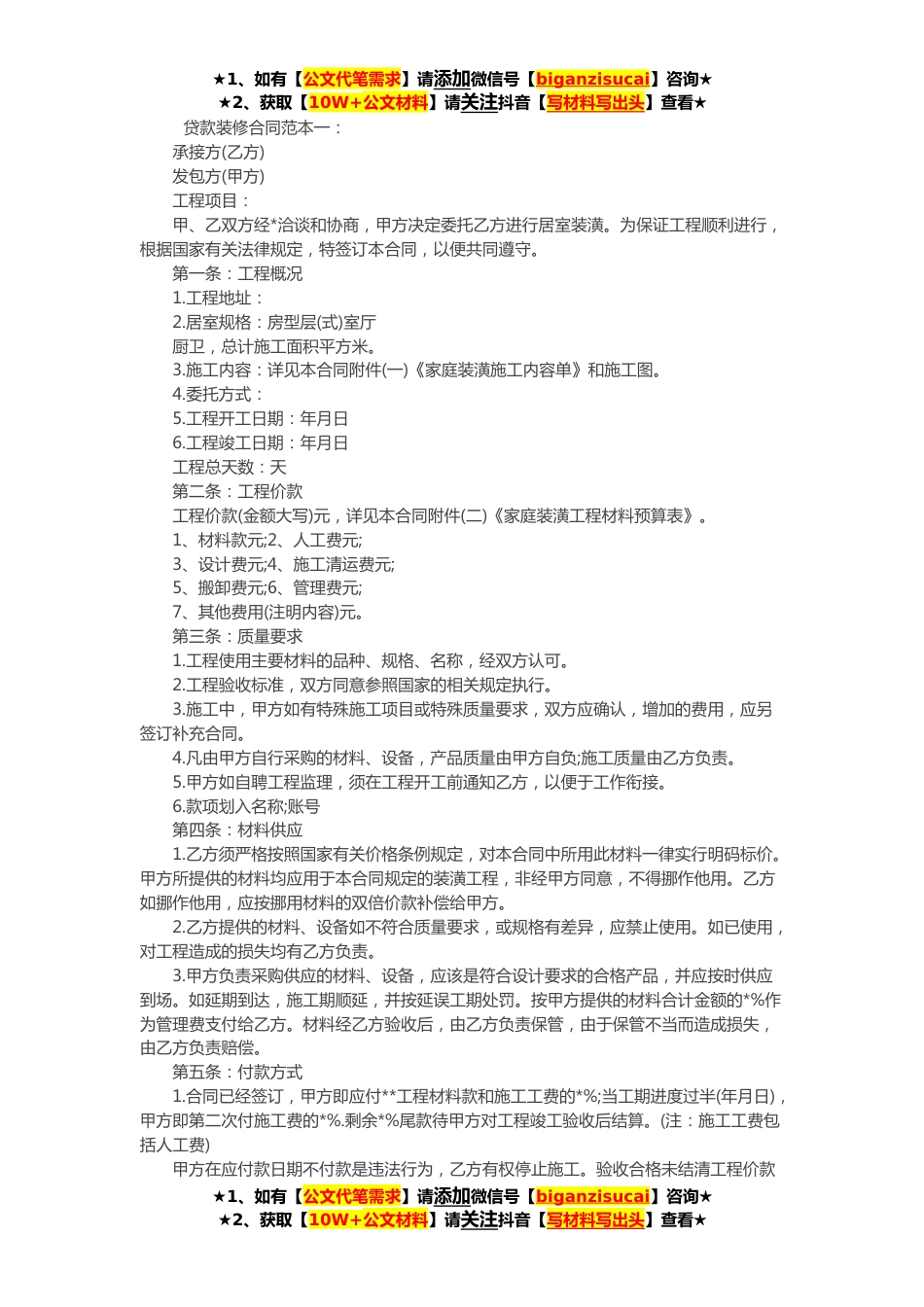 ★1、如有【公文代笔需求】请添加微信号【biganzisucai】咨询★★2、获取【10W+公文材料】请关注抖音【写材料写出头】查看★贷款装修合同范本一:承接方(乙方)发包方(甲方)工程项目:甲、乙双方经*洽谈和协商,甲方决定委托乙方进行居室装潢。为保证工程顺利进行,根据国家有关法律规定,特签订本合同,以便共同遵守。第一条:工程概况1.工程地址:2.居室规格:房型层(式)室厅厨卫,总计施工面积平方米。3.施工内容:详见本合同附件(一)《家庭装潢施工内容单》和施工图。4.委托方式:5.工程开工日期:年月日6.工程竣工日期:年月日工程总天数:天第二条:工程价款工程价款(金额大写)元,详见本合同附件(二)《家庭装潢工程材料预算表》。1、材料款元;2、人工费元;3、设计费元;4、施工清运费元;5、搬卸费元;6、管理...