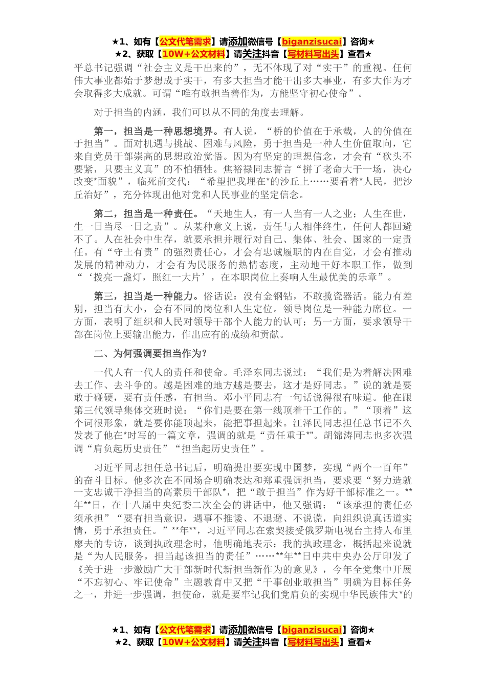 ★1、如有【公文代笔需求】请添加微信号【biganzisucai】咨询★★2、获取【10W+公文材料】请关注抖音【写材料写出头】查看★根据安排,现在由我为大家讲一堂专题党课。下面,我围绕勇于担当、积极作为这一专题,从什么是担当作为、为何强调要担当作为、如何担当作为三个方面跟大家谈个人认识和体会,与大家进行交流、共勉。一、什么是担当作为“担当”一词最早见于《朱子语类》,意为承担、担负责任、任务等,后也用来指敢于承担责任,有魄力。在我们党的语境中,担当就是“责任”,正如习近平总书记指出所指的那样,“必须有责任重于*的意识,坚持党的原则第一、党的事业第一、人民利益第一,敢于旗帜鲜明,敢于较真碰硬,对工作任劳任怨、尽心竭力、善始善终、善作善成”。敢于担当作为共产党人一以贯之的政治品...