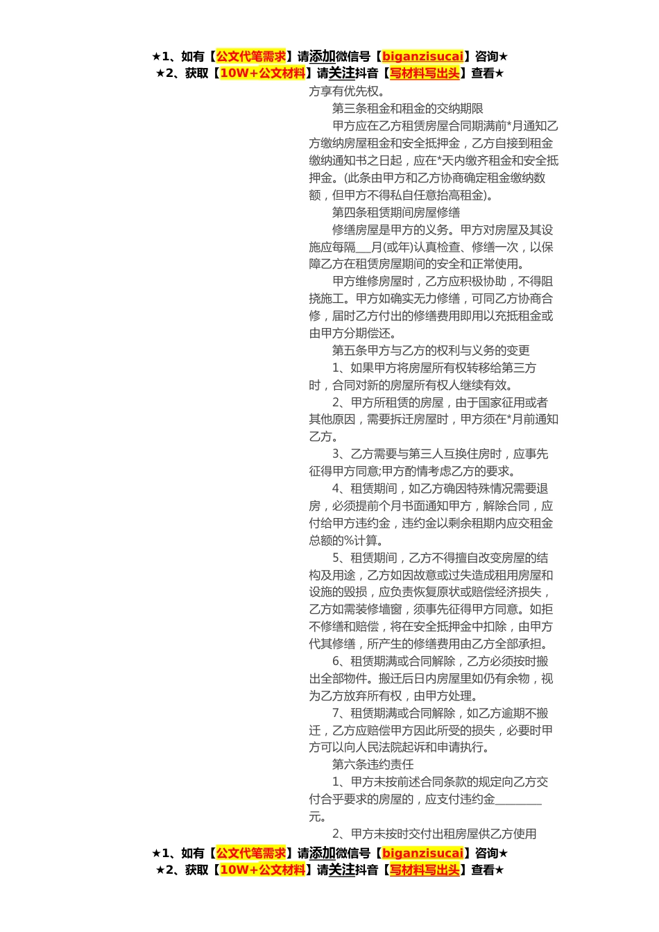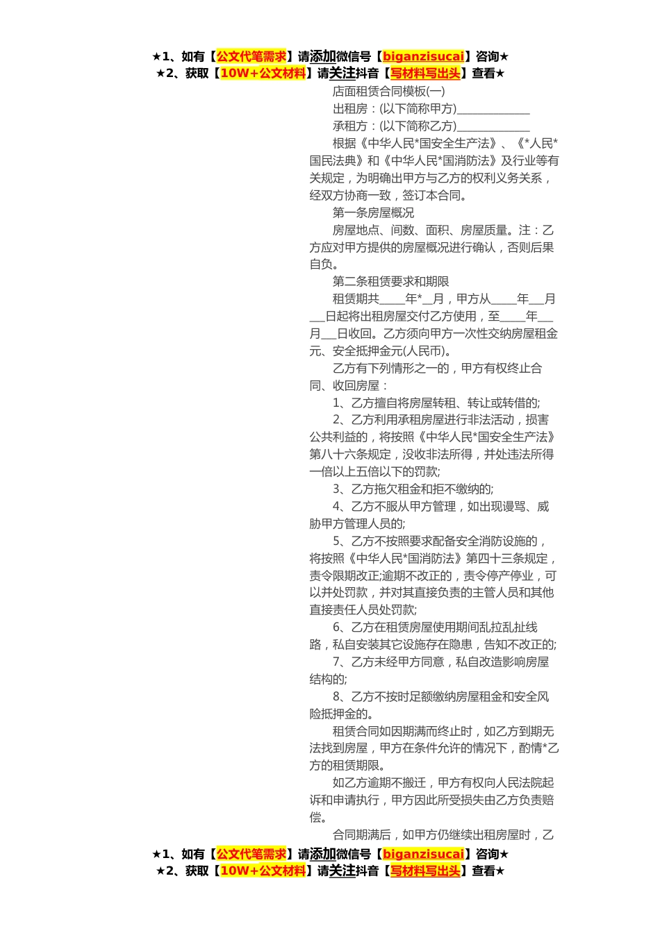 ★1、如有【公文代笔需求】请添加微信号【biganzisucai】咨询★★2、获取【10W+公文材料】请关注抖音【写材料写出头】查看★店面租赁合同模板(一)出租房:(以下简称甲方)______________承租方:(以下简称乙方)______________根据《中华人民*国安全生产法》、《*人民*国民法典》和《中华人民*国消防法》及行业等有关规定,为明确出甲方与乙方的权利义务关系,经双方协商一致,签订本合同。第一条房屋概况房屋地点、间数、面积、房屋质量。注:乙方应对甲方提供的房屋概况进行确认,否则后果自负。第二条租赁要求和期限租赁期共_____年*__月,甲方从_____年___月___日起将出租房屋交付乙方使用,至_____年___月___日收回。乙方须向甲方一次性交纳房屋租金元、安全抵押金元(人民币)。乙方有下列情形之一的,甲方有权...
