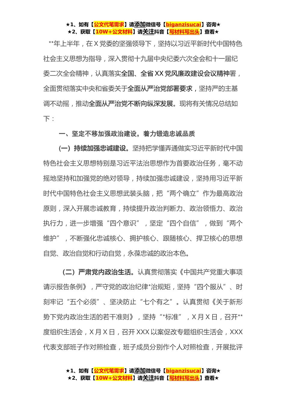 ★1、如有【公文代笔需求】请添加微信号【biganzisucai】咨询★★2、获取【10W+公文材料】请关注抖音【写材料写出头】查看★**年上半年,在X党委的坚强领导下,坚持以习近平新时代中国特色社会主义思想为指导,深入贯彻十九届中央纪委六次全会和十一届纪委二次全会精神,认真落实全国、全省XX党风廉政建设会议精神署,全面贯彻落实中央和省委关于全面从严治党部署要求,坚持严的主基调不动摇,推动全面从严治党不断向纵深发展。现将有关情况总结如下:一、坚定不移加强政治建设,着力锻造忠诚品质(一)持续加强忠诚建设。坚持把学懂弄通做实习近平新时代中国特色社会主义思想特别是习近平法治思想作为首要政治任务,毫不动摇地坚持和加强党的绝对领导,持续加强忠诚建设,坚持用习近平新时代中国特色社会主义思想...