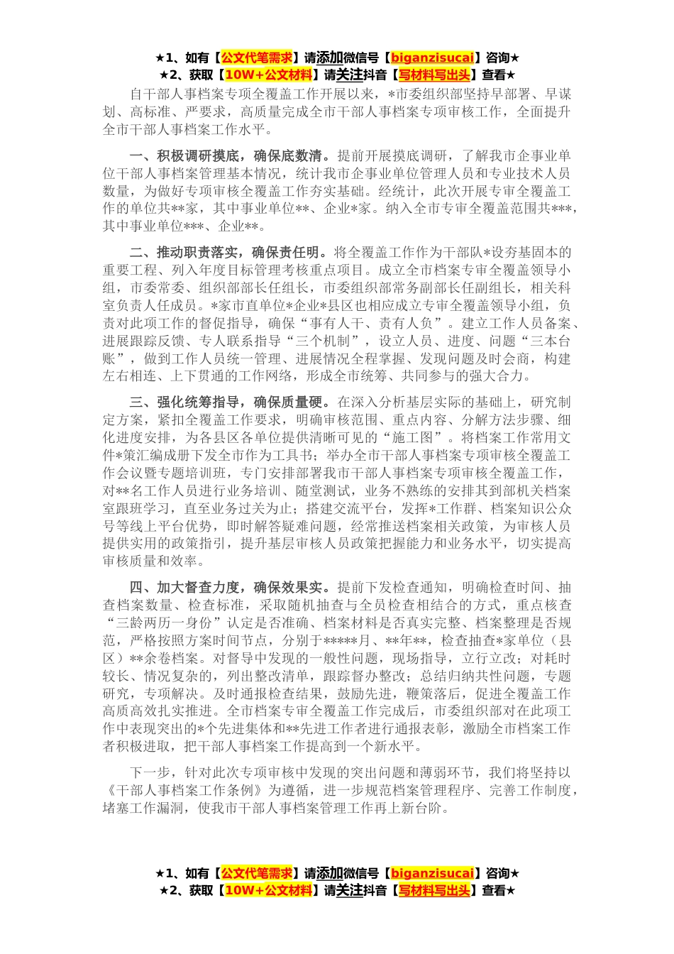 ★1、如有【公文代笔需求】请添加微信号【biganzisucai】咨询★★2、获取【10W+公文材料】请关注抖音【写材料写出头】查看★自干部人事档案专项全覆盖工作开展以来,*市委组织部坚持早部署、早谋划、高标准、严要求,高质量完成全市干部人事档案专项审核工作,全面提升全市干部人事档案工作水平。一、积极调研摸底,确保底数清。提前开展摸底调研,了解我市企事业单位干部人事档案管理基本情况,统计我市企事业单位管理人员和专业技术人员数量,为做好专项审核全覆盖工作夯实基础。经统计,此次开展专审全覆盖工作的单位共**家,其中事业单位**、企业*家。纳入全市专审全覆盖范围共***,其中事业单位***、企业**。二、推动职责落实,确保责任明。将全覆盖工作作为干部队*设夯基固本的重要工程、列入年度目标管理考...
