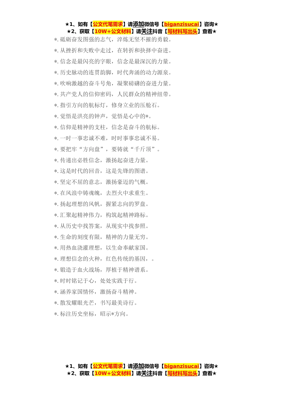 ★1、如有【公文代笔需求】请添加微信号【biganzisucai】咨询★★2、获取【10W+公文材料】请关注抖音【写材料写出头】查看★1.如同一座丰碑,镌刻着不屈不挠、顽强搏击的精神品格;如同一座*,照亮了继往开来、壮阔豪迈的*道路。2.没有理想动力的人生,如同缺乏生机的原野;没有信念动力的事业,就像失去引擎的航船。3.思想境界不会随着党龄的增加而自然提高,理想信念也不会随着职务的上升而必然坚定。4.拥有了理想信念,将信心满怀、步履坚定;拥有了理想信念,将众志成城、战无不胜。5.越是砥砺奋进的时代,越需要思想的凝聚;越是成长拔节的时期,越需要精神的支撑。6.历史前行的每一步,都需要精神的滋养;风雨无阻的每一程,都饱含精神的磨砺。7.铭刻着立党为公、执政为民的价值坐标,凝聚着顶天立地、上下...