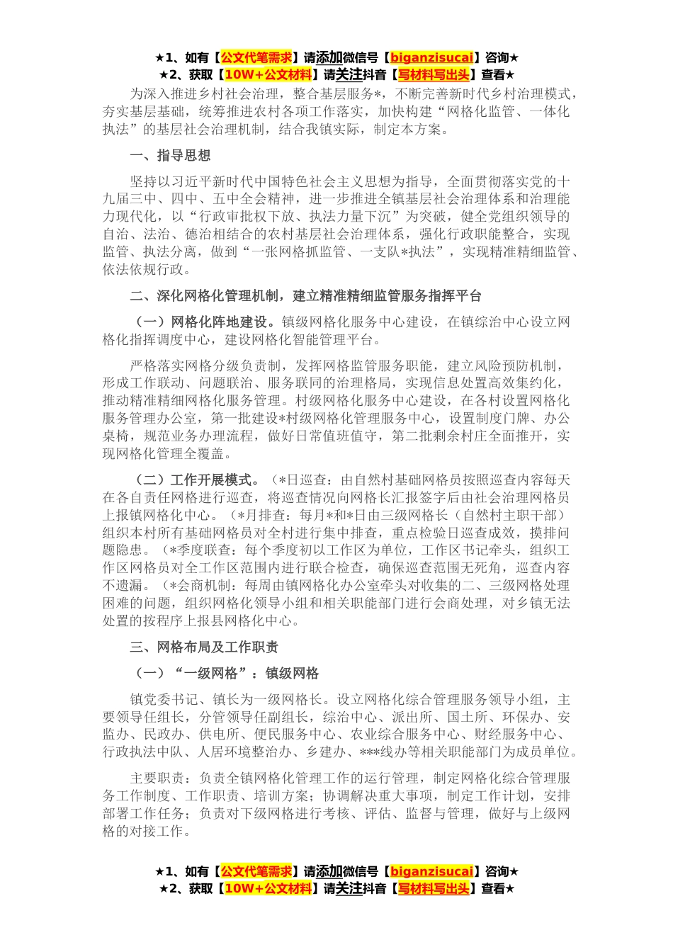 ★1、如有【公文代笔需求】请添加微信号【biganzisucai】咨询★★2、获取【10W+公文材料】请关注抖音【写材料写出头】查看★为深入推进乡村社会治理,整合基层服务*,不断完善新时代乡村治理模式,夯实基层基础,统筹推进农村各项工作落实,加快构建“网格化监管、一体化执法”的基层社会治理机制,结合我镇实际,制定本方案。一、指导思想坚持以习近平新时代中国特色社会主义思想为指导,全面贯彻落实党的十九届三中、四中、五中全会精神,进一步推进全镇基层社会治理体系和治理能力现代化,以“行政审批权下放、执法力量下沉”为突破,健全党组织领导的自治、法治、德治相结合的农村基层社会治理体系,强化行政职能整合,实现监管、执法分离,做到“一张网格抓监管、一支队*执法”,实现精准精细监管、依法依规...