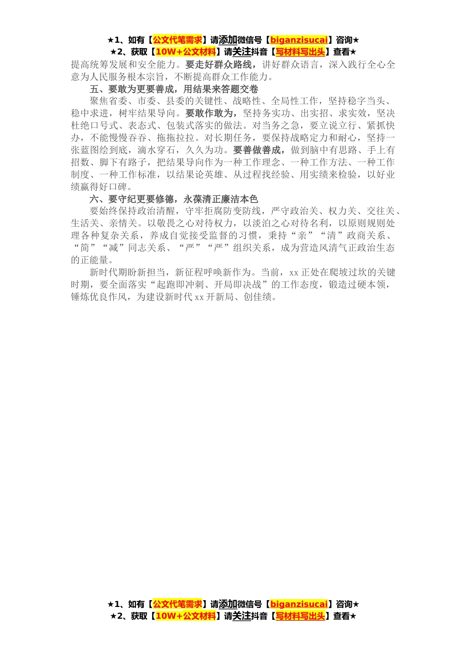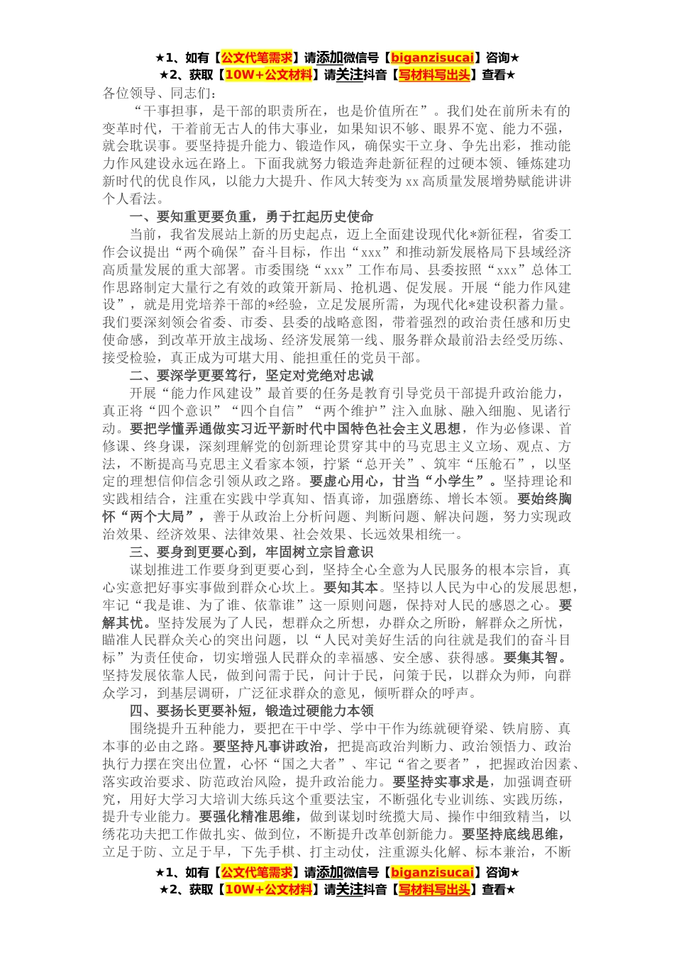 ★1、如有【公文代笔需求】请添加微信号【biganzisucai】咨询★★2、获取【10W+公文材料】请关注抖音【写材料写出头】查看★各位领导、同志们:“干事担事,是干部的职责所在,也是价值所在”。我们处在前所未有的变革时代,干着前无古人的伟大事业,如果知识不够、眼界不宽、能力不强,就会耽误事。要坚持提升能力、锻造作风,确保实干立身、争先出彩,推动能力作风建设永远在路上。下面我就努力锻造奔赴新征程的过硬本领、锤炼建功新时代的优良作风,以能力大提升、作风大转变为xx高质量发展增势赋能讲讲个人看法。一、要知重更要负重,勇于扛起历史使命当前,我省发展站上新的历史起点,迈上全面建设现代化*新征程,省委工作会议提出“两个确保”奋斗目标,作出“xxx”和推动新发展格局下县域经济高质量发展的...