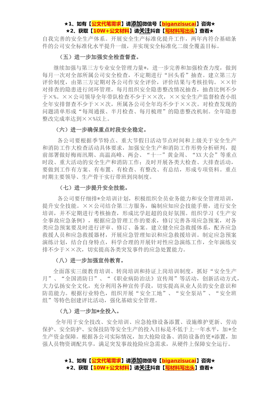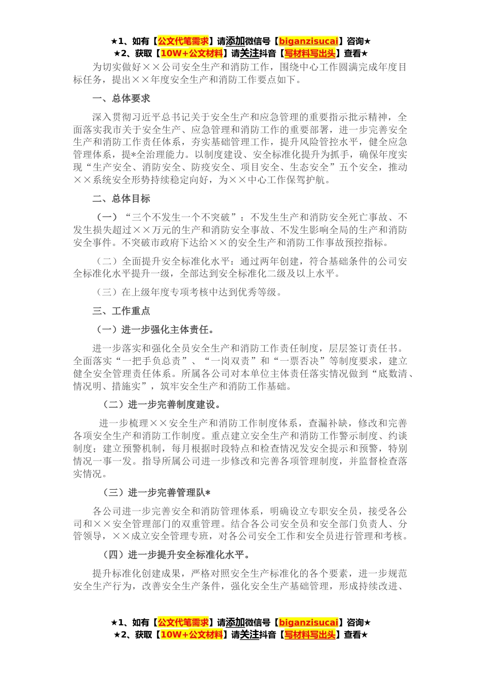 ★1、如有【公文代笔需求】请添加微信号【biganzisucai】咨询★★2、获取【10W+公文材料】请关注抖音【写材料写出头】查看★为切实做好××公司安全生产和消防工作,围绕中心工作圆满完成年度目标任务,提出××年度安全生产和消防工作要点如下。一、总体要求深入贯彻习近平总书记关于安全生产和应急管理的重要指示批示精神,全面落实我市关于安全生产、应急管理和消防工作的重要部署,进一步完善安全生产和消防工作责任体系,夯实基础管理工作,提升风险管控水平,健全应急管理体系,提*全治理能力。以制度建设、安全标准化提升为抓手,确保年度实现“生产安全、消防安全、防疫安全、项目安全、生态安全”五个安全,推动××系统安全形势持续稳定向好,为××中心工作保驾护航。二、总体目标(一)“三个不发生一...