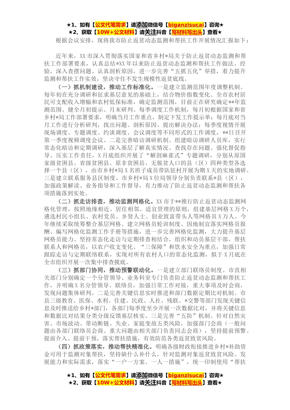 ★1、如有【公文代笔需求】请添加微信号【biganzisucai】咨询★★2、获取【10W+公文材料】请关注抖音【写材料写出头】查看★根据会议安排,现将我市防止返贫动态监测和帮扶工作开展情况汇报如下:近年来,XX市深入贯彻落实国家和省乡村*局关于防止返贫动态监测和帮扶工作部署要求,认真总结*XX年以来防止返贫动态监测和帮扶工作做法、经验,深入查摆问题、认真剖析原因,进一步完善“五抓五化”举措,着力提升监测和帮扶工作实效,坚决守住不发生规模性返贫底线。(一)抓机制建设,推动工作标准化。一是建立监测范围年度调整机制。每年初在充分调研和征求基层意见的基础上,结合物价指数变化、全市农村居民可支配收入增幅和农村低保标准,确定监测范围,目前正在研究确定**年监测范围。健全月初提示、月末研判、...