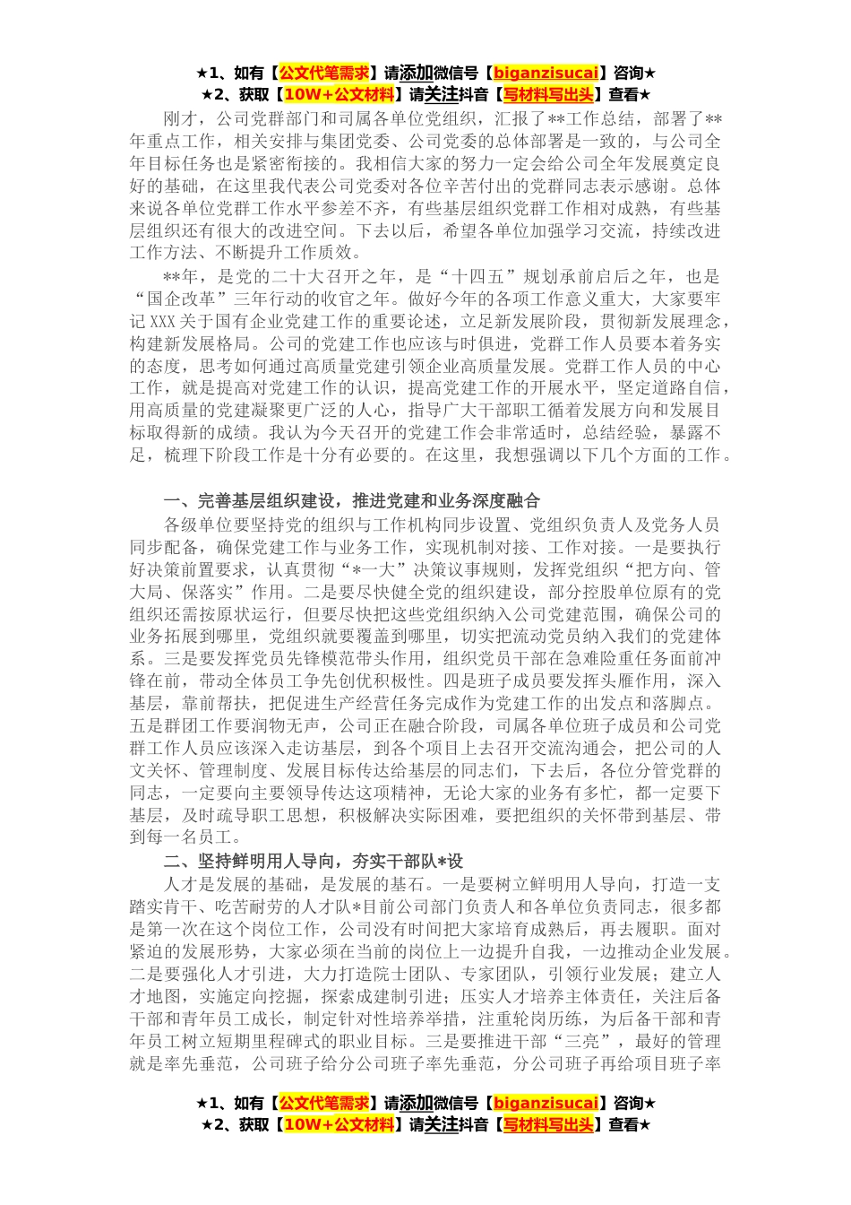 ★1、如有【公文代笔需求】请添加微信号【biganzisucai】咨询★★2、获取【10W+公文材料】请关注抖音【写材料写出头】查看★刚才,公司党群部门和司属各单位党组织,汇报了**工作总结,部署了**年重点工作,相关安排与集团党委、公司党委的总体部署是一致的,与公司全年目标任务也是紧密衔接的。我相信大家的努力一定会给公司全年发展奠定良好的基础,在这里我代表公司党委对各位辛苦付出的党群同志表示感谢。总体来说各单位党群工作水平参差不齐,有些基层组织党群工作相对成熟,有些基层组织还有很大的改进空间。下去以后,希望各单位加强学习交流,持续改进工作方法、不断提升工作质效。**年,是党的二十大召开之年,是“十四五”规划承前启后之年,也是“国企改革”三年行动的收官之年。做好今年的各项工作意...