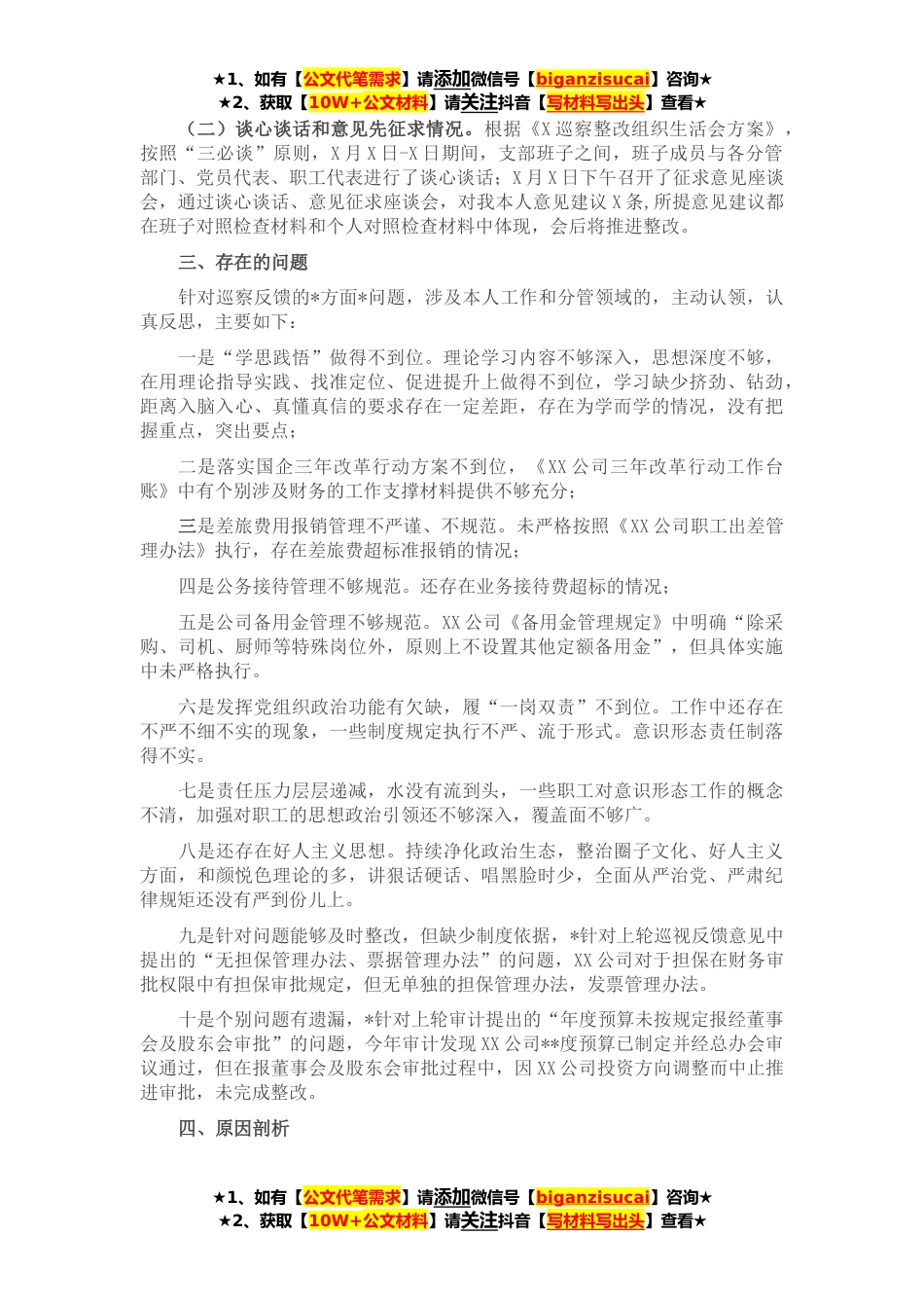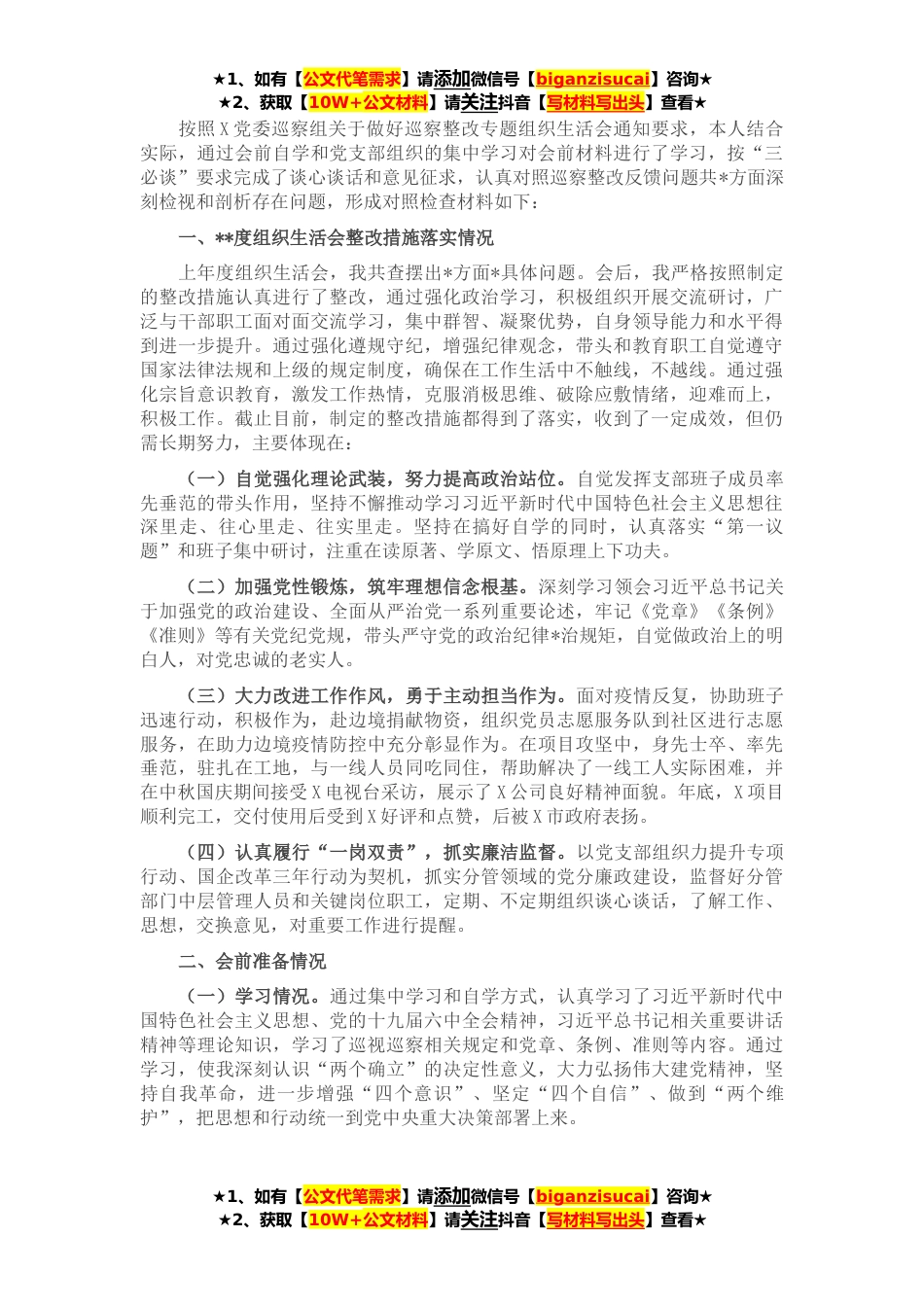 ★1、如有【公文代笔需求】请添加微信号【biganzisucai】咨询★★2、获取【10W+公文材料】请关注抖音【写材料写出头】查看★按照X党委巡察组关于做好巡察整改专题组织生活会通知要求,本人结合实际,通过会前自学和党支部组织的集中学习对会前材料进行了学习,按“三必谈”要求完成了谈心谈话和意见征求,认真对照巡察整改反馈问题共*方面深刻检视和剖析存在问题,形成对照检查材料如下:一、**度组织生活会整改措施落实情况上年度组织生活会,我共查摆出*方面*具体问题。会后,我严格按照制定的整改措施认真进行了整改,通过强化政治学习,积极组织开展交流研讨,广泛与干部职工面对面交流学习,集中群智、凝聚优势,自身领导能力和水平得到进一步提升。通过强化遵规守纪,增强纪律观念,带头和教育职工自觉遵守...