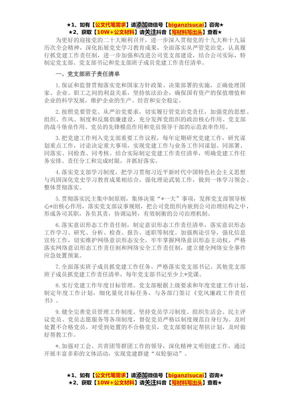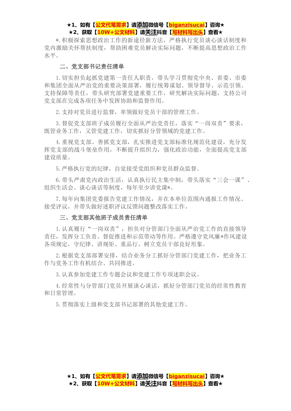 ★1、如有【公文代笔需求】请添加微信号【biganzisucai】咨询★★2、获取【10W+公文材料】请关注抖音【写材料写出头】查看★为更好的迎接党的二十大顺利召开,进一步深入贯彻党的十九大和十九届历次全会精神,深化拓展党史学习教育成果,全面落实从严管党治党,认真履行抓党建工作责任制,进一步加强和改进公司党支部建设,结合公司实际,特制定党支部、党支部书记和党支部班子成员党建工作责任清单。一、党支部班子责任清单1.保证和监督贯彻落实党和国家方针政策、决策部署的实施,正确处理国家、企业、职工之间的利益关系,坚持依法治企,确保国有资产的保值增值和企业的科学发展,维护企业的生产、经营和安全稳定。2.按照党要管党、从严治党要求,切实履行管党治党责任,加强党的思想、组织、作风、制度和反腐...
