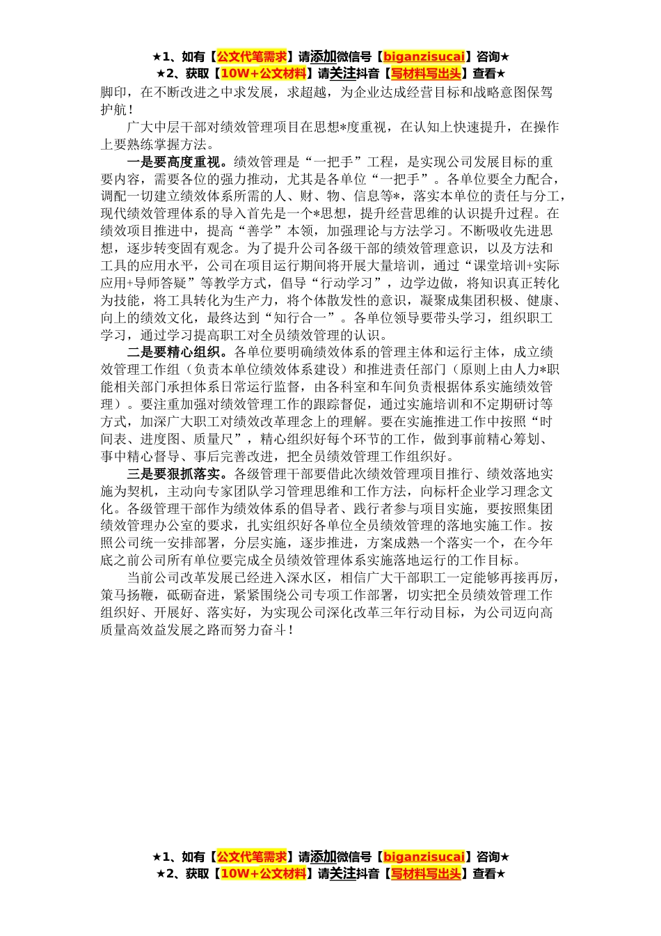★1、如有【公文代笔需求】请添加微信号【biganzisucai】咨询★★2、获取【10W+公文材料】请关注抖音【写材料写出头】查看★同志们:大家好!今天我们在这里召开绩效管理专题培训会议,这是今年的一项重要的既定工作。实行全员绩效考核,是公司三年深化改革的重要举措,是完成理顺工资体系改革后,推动改革向深水区推进、激发全员活力的一项重要工作。今年是三年深化改革的收官之年,解决这一问题,是我们改革必须推进并要做好的一项重要工作。公司推进全员、全方位绩效考核主要有两方面原因:一方面从国家层面来讲:是国务院对国企三项制度改革的要求,涉及劳动、人事、分配三个方面,深化国企三项制度改革是推进国有企业改革的重要举措,对于完善国有企业市场化经营机制,推动国有企业高质量发展,增强国有经济...