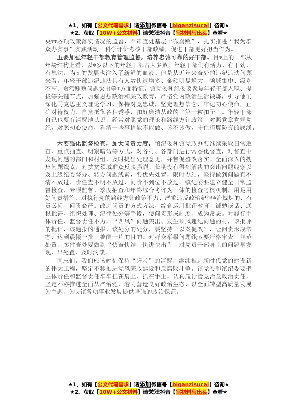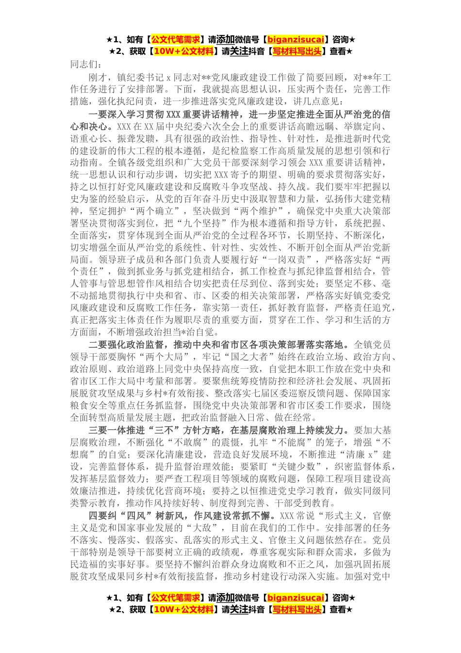 ★1、如有【公文代笔需求】请添加微信号【biganzisucai】咨询★★2、获取【10W+公文材料】请关注抖音【写材料写出头】查看★同志们:刚才,镇纪委书记x同志对**党风廉政建设工作做了简要回顾,对**年工作任务进行了安排部署。下面,我就提高思想认识,压实两个责任,完善工作措施,强化执纪问责,进一步推进落实党风廉政建设,讲几点意见:一要深入学习贯彻XXX重要讲话精神,进一步坚定推进全面从严治党的信心和决心。XXX在XX届中央纪委六次全会上的重要讲话高瞻远瞩、举旗定向、语重心长、振聋发聩,具有很强的政治性、指导性、针对性,是推进新时代党的建设新的伟大工程的根本遵循,是纪检监察工作高质量发展的思想引领和行动指南。全镇各级党组织和广大党员干部要深刻学习领会XXX重要讲话精神,统一思想认识和...