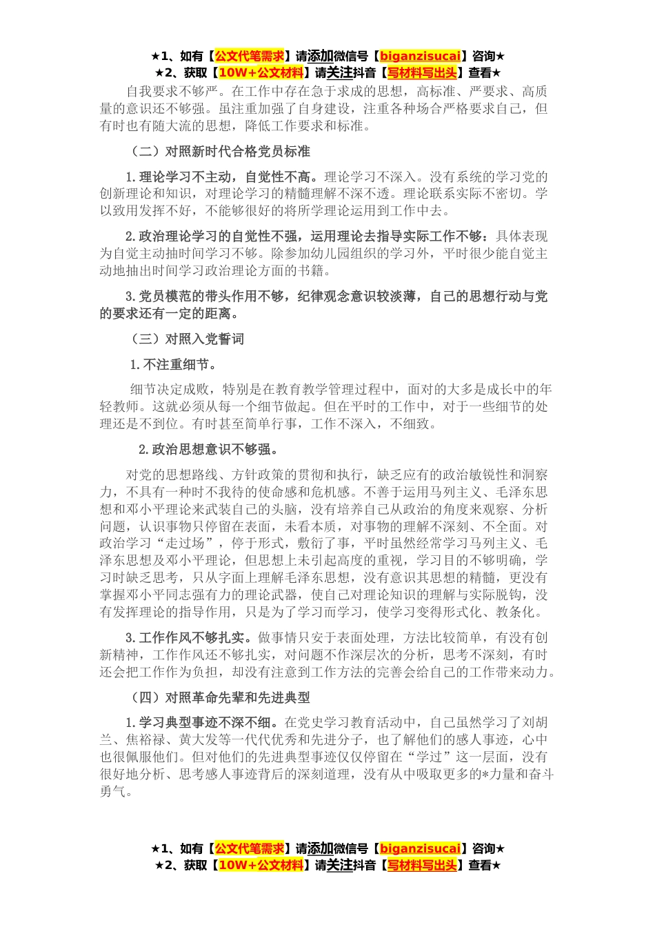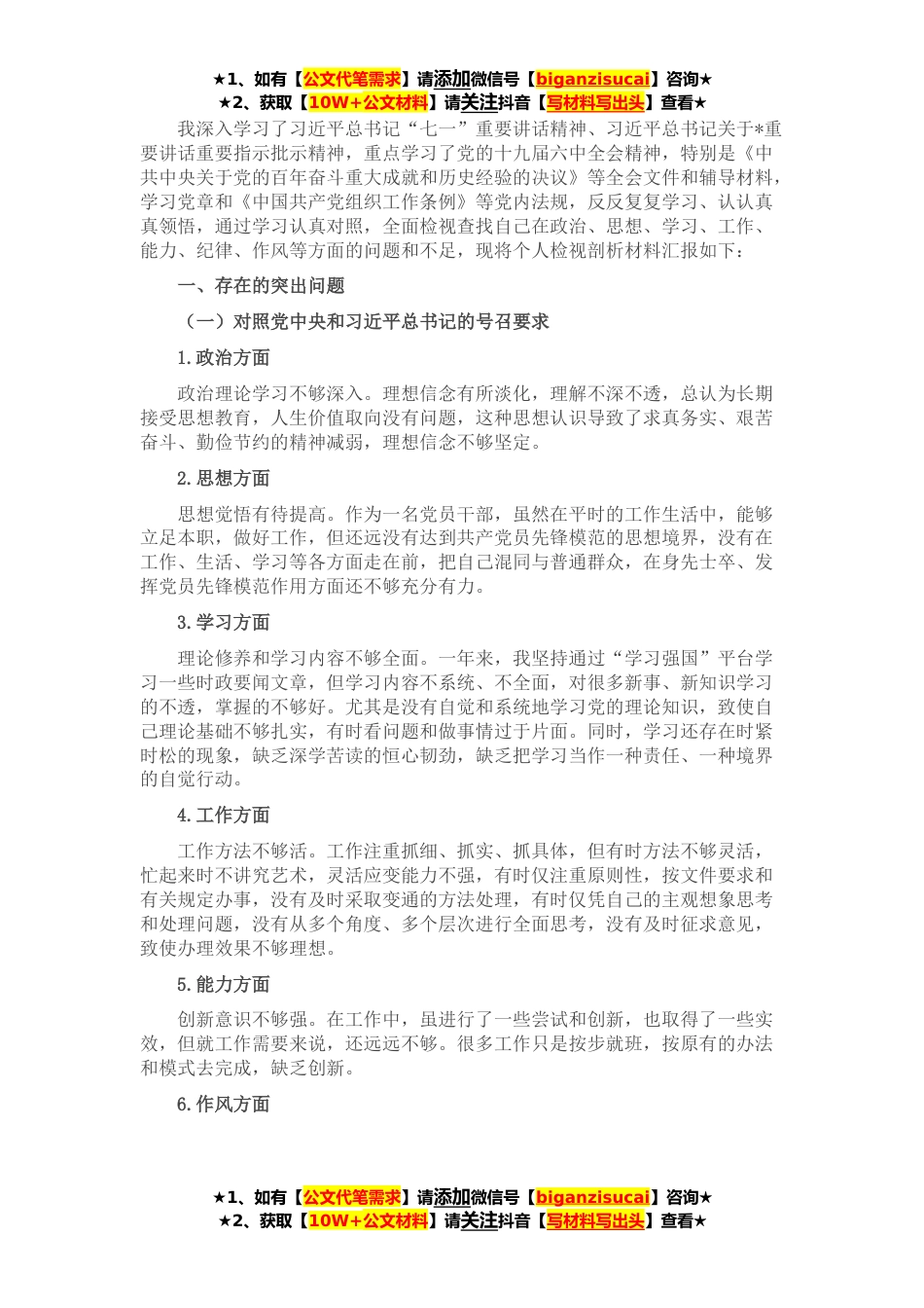 ★1、如有【公文代笔需求】请添加微信号【biganzisucai】咨询★★2、获取【10W+公文材料】请关注抖音【写材料写出头】查看★我深入学习了习近平总书记“七一”重要讲话精神、习近平总书记关于*重要讲话重要指示批示精神,重点学习了党的十九届六中全会精神,特别是《中共中央关于党的百年奋斗重大成就和历史经验的决议》等全会文件和辅导材料,学习党章和《中国共产党组织工作条例》等党内法规,反反复复学习、认认真真领悟,通过学习认真对照,全面检视查找自己在政治、思想、学习、工作、能力、纪律、作风等方面的问题和不足,现将个人检视剖析材料汇报如下:一、存在的突出问题(一)对照党中央和习近平总书记的号召要求1.政治方面政治理论学习不够深入。理想信念有所淡化,理解不深不透,总认为长期接受思想教...