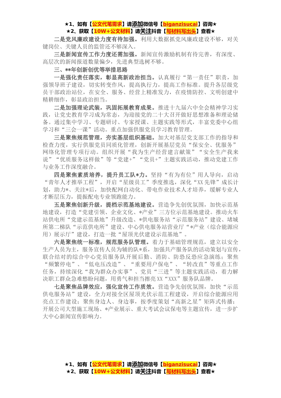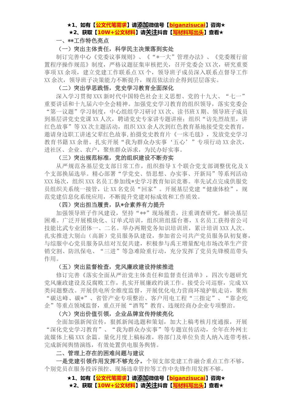 ★1、如有【公文代笔需求】请添加微信号【biganzisucai】咨询★★2、获取【10W+公文材料】请关注抖音【写材料写出头】查看★一、**工作特色亮点(一)突出主体责任,科学民主决策落到实处制订完善中心《党委议事规则》、《“*一大”管理办法》、《党委履行前置程序操作规范》制度,严格议题征集审核把关,召开党委会XX次,研究重要事项XX余项,建立党建工作联系点XX个,领导班子成员深入联系点督导工作XX余次,领导班子决策能力不断提升,规范依法治企得到层层落实。(二)突出学思践悟,党史学习教育全面深化深入学习贯彻XXX新时代中国特色社会主义思想、党的十九大、“七一”重要讲话和十九届六中全会精神。加强党史学习教育的组织领导,落实党委会“第一议题”学习制度,中心组组学习研讨XX次、读书班X期、领导...