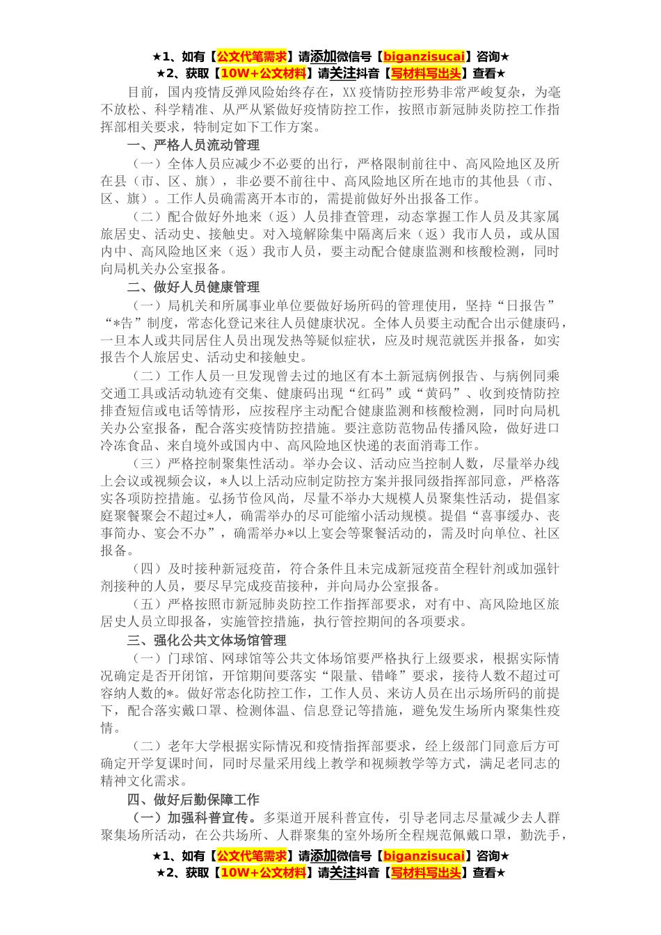 ★1、如有【公文代笔需求】请添加微信号【biganzisucai】咨询★★2、获取【10W+公文材料】请关注抖音【写材料写出头】查看★目前,国内疫情反弹风险始终存在,XX疫情防控形势非常严峻复杂,为毫不放松、科学精准、从严从紧做好疫情防控工作,按照市新冠肺炎防控工作指挥部相关要求,特制定如下工作方案。一、严格人员流动管理(一)全体人员应减少不必要的出行,严格限制前往中、高风险地区及所在县(市、区、旗),非必要不前往中、高风险地区所在地市的其他县(市、区、旗)。工作人员确需离开本市的,需提前做好外出报备工作。(二)配合做好外地来(返)人员排查管理,动态掌握工作人员及其家属旅居史、活动史、接触史。对入境解除集中隔离后来(返)我市人员,或从国内中、高风险地区来(返)我市人员,要主...