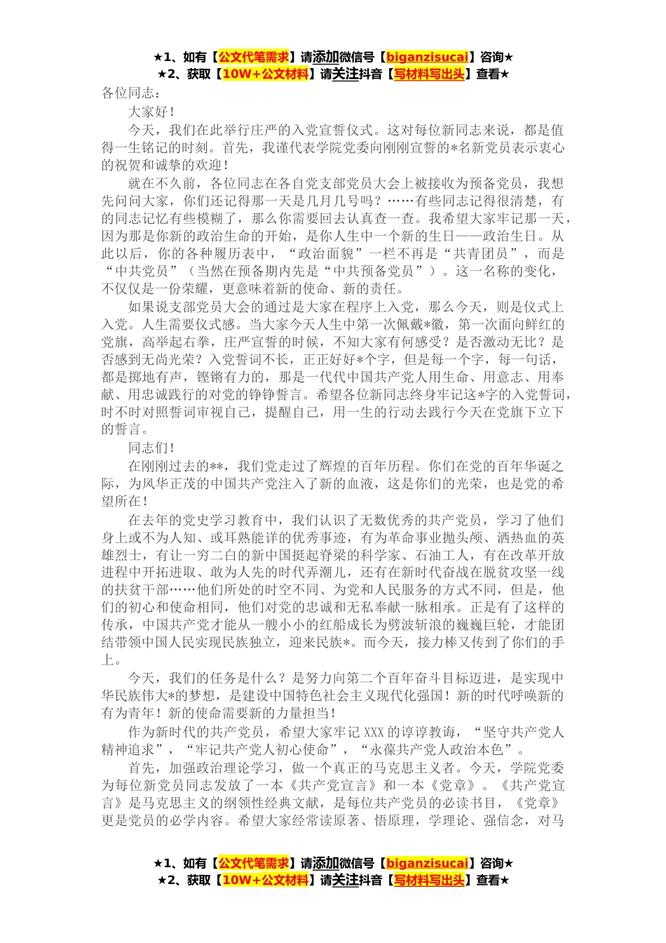 ★1、如有【公文代笔需求】请添加微信号【biganzisucai】咨询★★2、获取【10W+公文材料】请关注抖音【写材料写出头】查看★各位同志:大家好!今天,我们在此举行庄严的入党宣誓仪式。这对每位新同志来说,都是值得一生铭记的时刻。首先,我谨代表学院党委向刚刚宣誓的*名新党员表示衷心的祝贺和诚挚的欢迎!就在不久前,各位同志在各自党支部党员大会上被接收为预备党员,我想先问问大家,你们还记得那一天是几月几号吗?……有些同志记得很清楚,有的同志记忆有些模糊了,那么你需要回去认真查一查。我希望大家牢记那一天,因为那是你新的政治生命的开始,是你人生中一个新的生日——政治生日。从此以后,你的各种履历表中,“政治面貌”一栏不再是“共青团员”,而是“中共党员”(当然在预备期内先是“中共预...