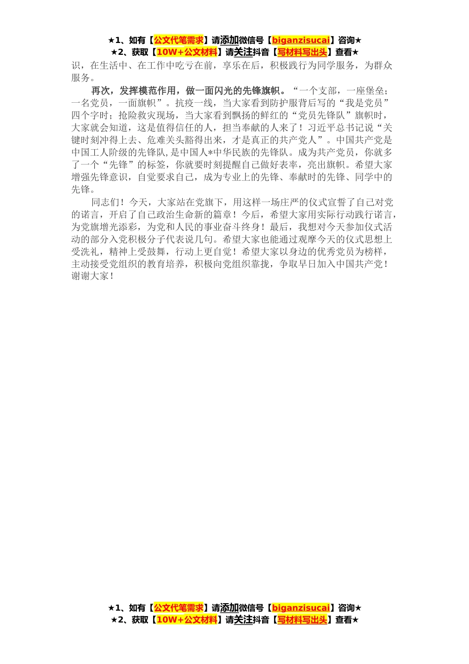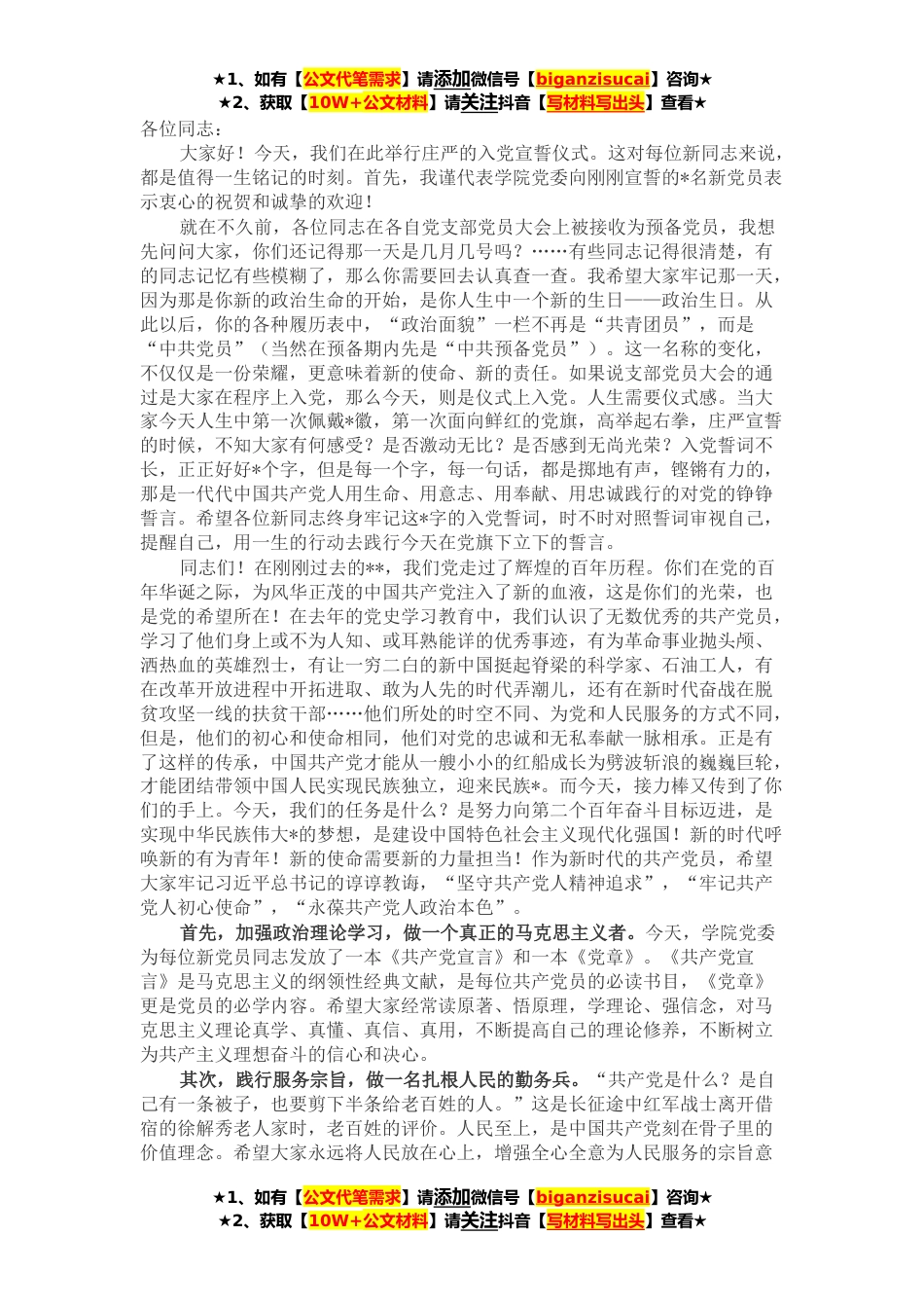 ★1、如有【公文代笔需求】请添加微信号【biganzisucai】咨询★★2、获取【10W+公文材料】请关注抖音【写材料写出头】查看★各位同志:大家好!今天,我们在此举行庄严的入党宣誓仪式。这对每位新同志来说,都是值得一生铭记的时刻。首先,我谨代表学院党委向刚刚宣誓的*名新党员表示衷心的祝贺和诚挚的欢迎!就在不久前,各位同志在各自党支部党员大会上被接收为预备党员,我想先问问大家,你们还记得那一天是几月几号吗?……有些同志记得很清楚,有的同志记忆有些模糊了,那么你需要回去认真查一查。我希望大家牢记那一天,因为那是你新的政治生命的开始,是你人生中一个新的生日——政治生日。从此以后,你的各种履历表中,“政治面貌”一栏不再是“共青团员”,而是“中共党员”(当然在预备期内先是“中共预...