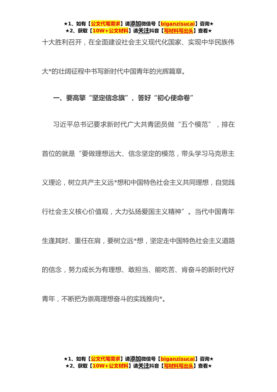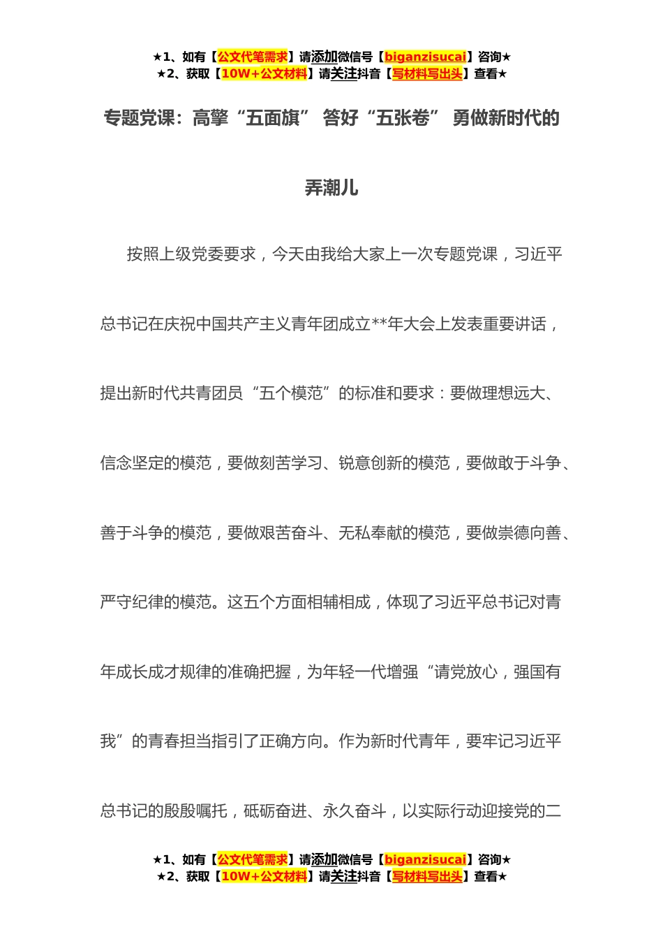 ★1、如有【公文代笔需求】请添加微信号【biganzisucai】咨询★★2、获取【10W+公文材料】请关注抖音【写材料写出头】查看★专题党课:高擎“五面旗”答好“五张卷”勇做新时代的弄潮儿按照上级党委要求,今天由我给大家上一次专题党课,习近平总书记在庆祝中国共产主义青年团成立**年大会上发表重要讲话,提出新时代共青团员“五个模范”的标准和要求:要做理想远大、信念坚定的模范,要做刻苦学习、锐意创新的模范,要做敢于斗争、善于斗争的模范,要做艰苦奋斗、无私奉献的模范,要做崇德向善、严守纪律的模范。这五个方面相辅相成,体现了习近平总书记对青年成长成才规律的准确把握,为年轻一代增强“请党放心,强国有我”的青春担当指引了正确方向。作为新时代青年,要牢记习近平总书记的殷殷嘱托,砥砺奋进...