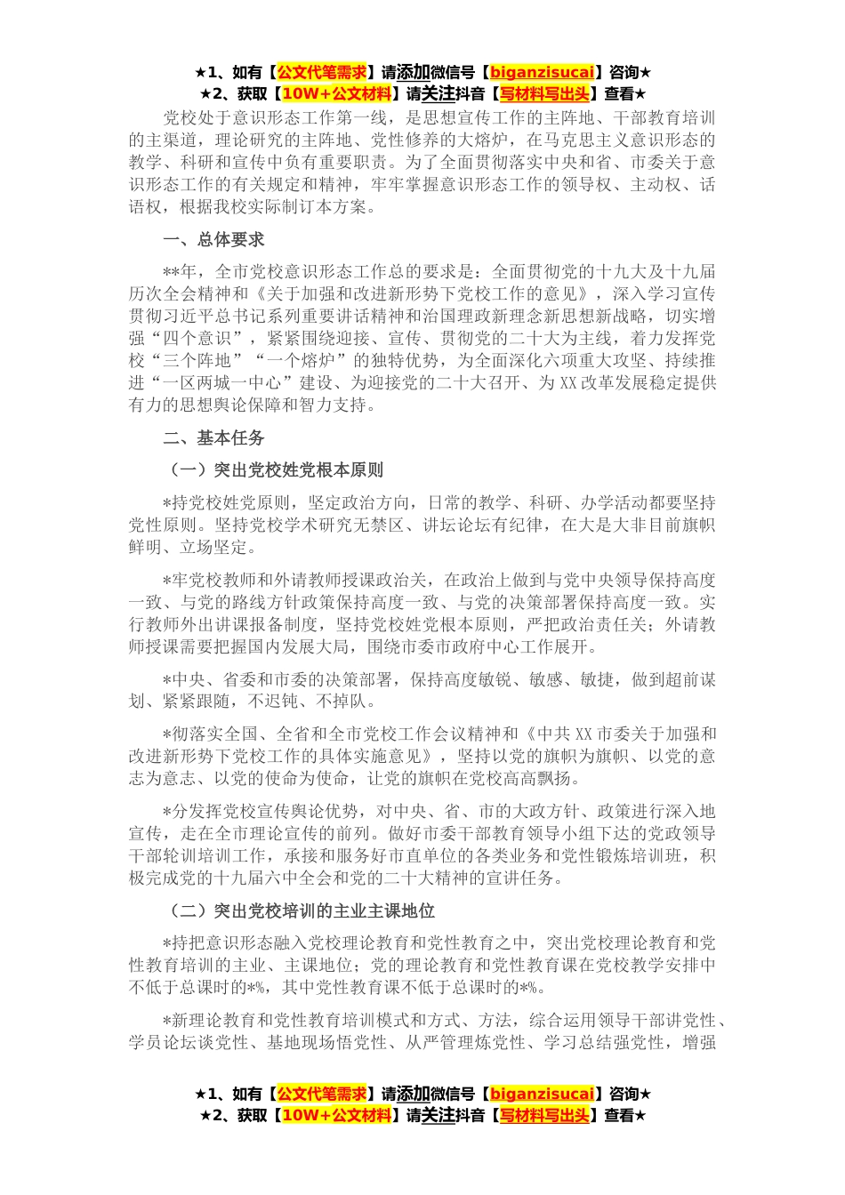 ★1、如有【公文代笔需求】请添加微信号【biganzisucai】咨询★★2、获取【10W+公文材料】请关注抖音【写材料写出头】查看★党校处于意识形态工作第一线,是思想宣传工作的主阵地、干部教育培训的主渠道,理论研究的主阵地、党性修养的大熔炉,在马克思主义意识形态的教学、科研和宣传中负有重要职责。为了全面贯彻落实中央和省、市委关于意识形态工作的有关规定和精神,牢牢掌握意识形态工作的领导权、主动权、话语权,根据我校实际制订本方案。一、总体要求**年,全市党校意识形态工作总的要求是:全面贯彻党的十九大及十九届历次全会精神和《关于加强和改进新形势下党校工作的意见》,深入学习宣传贯彻习近平总书记系列重要讲话精神和治国理政新理念新思想新战略,切实增强“四个意识”,紧紧围绕迎接、宣传、...