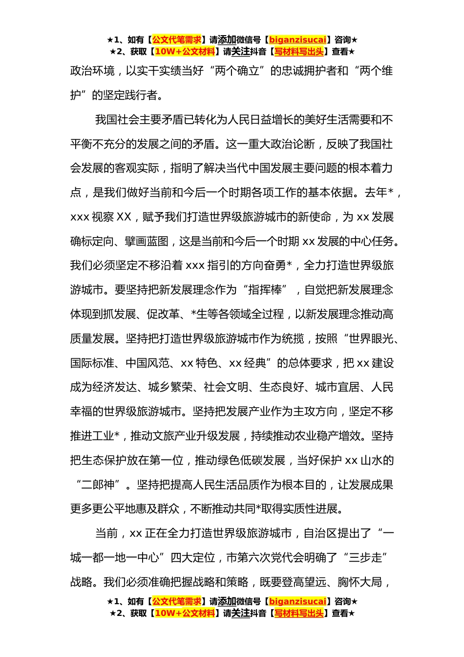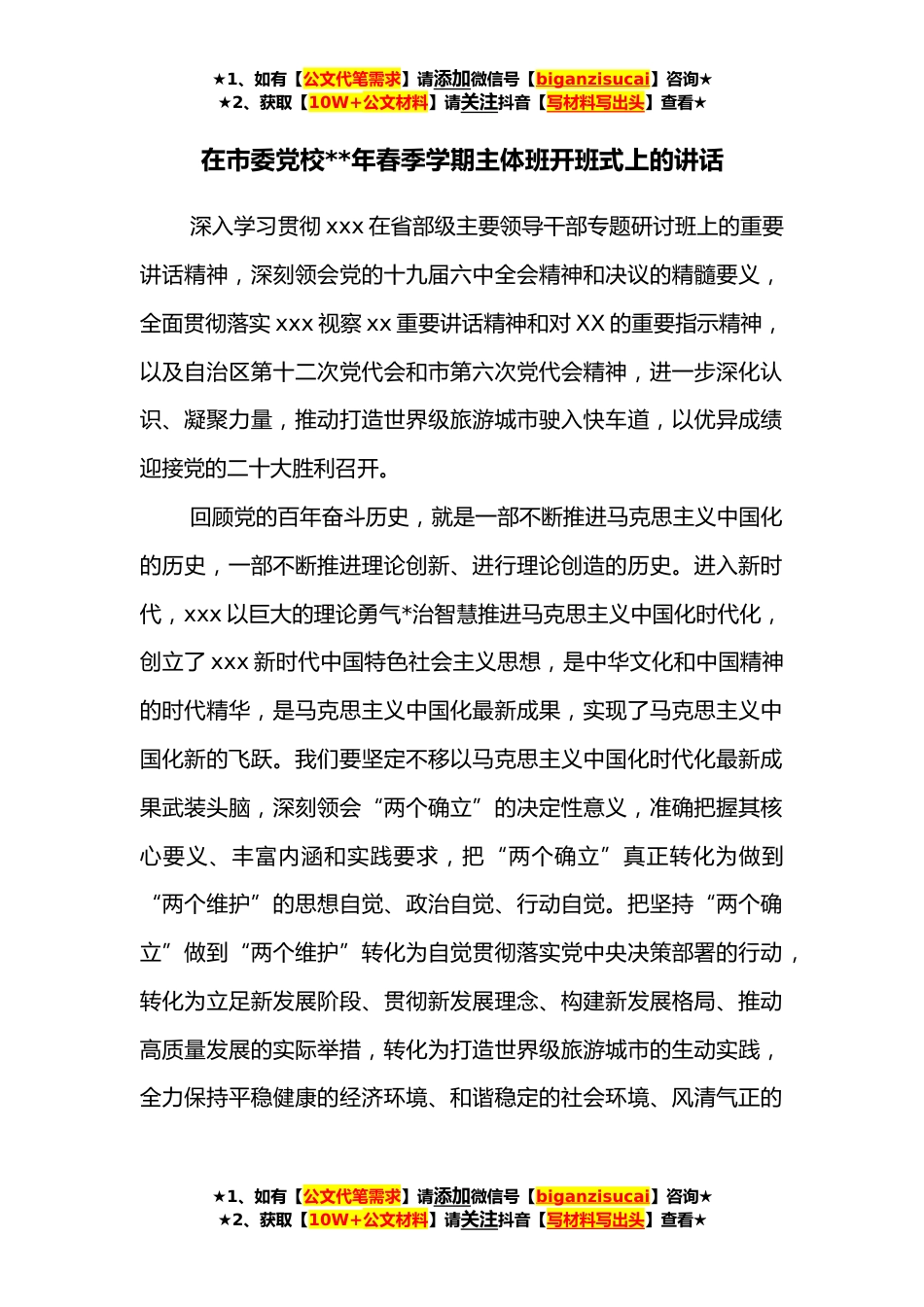 ★1、如有【公文代笔需求】请添加微信号【biganzisucai】咨询★★2、获取【10W+公文材料】请关注抖音【写材料写出头】查看★在市委党校**年春季学期主体班开班式上的讲话深入学习贯彻xxx在省部级主要领导干部专题研讨班上的重要讲话精神,深刻领会党的十九届六中全会精神和决议的精髓要义,全面贯彻落实xxx视察xx重要讲话精神和对XX的重要指示精神,以及自治区第十二次党代会和市第六次党代会精神,进一步深化认识、凝聚力量,推动打造世界级旅游城市驶入快车道,以优异成绩迎接党的二十大胜利召开。回顾党的百年奋斗历史,就是一部不断推进马克思主义中国化的历史,一部不断推进理论创新、进行理论创造的历史。进入新时代,xxx以巨大的理论勇气*治智慧推进马克思主义中国化时代化,创立了xxx新时代中国特色社会主...