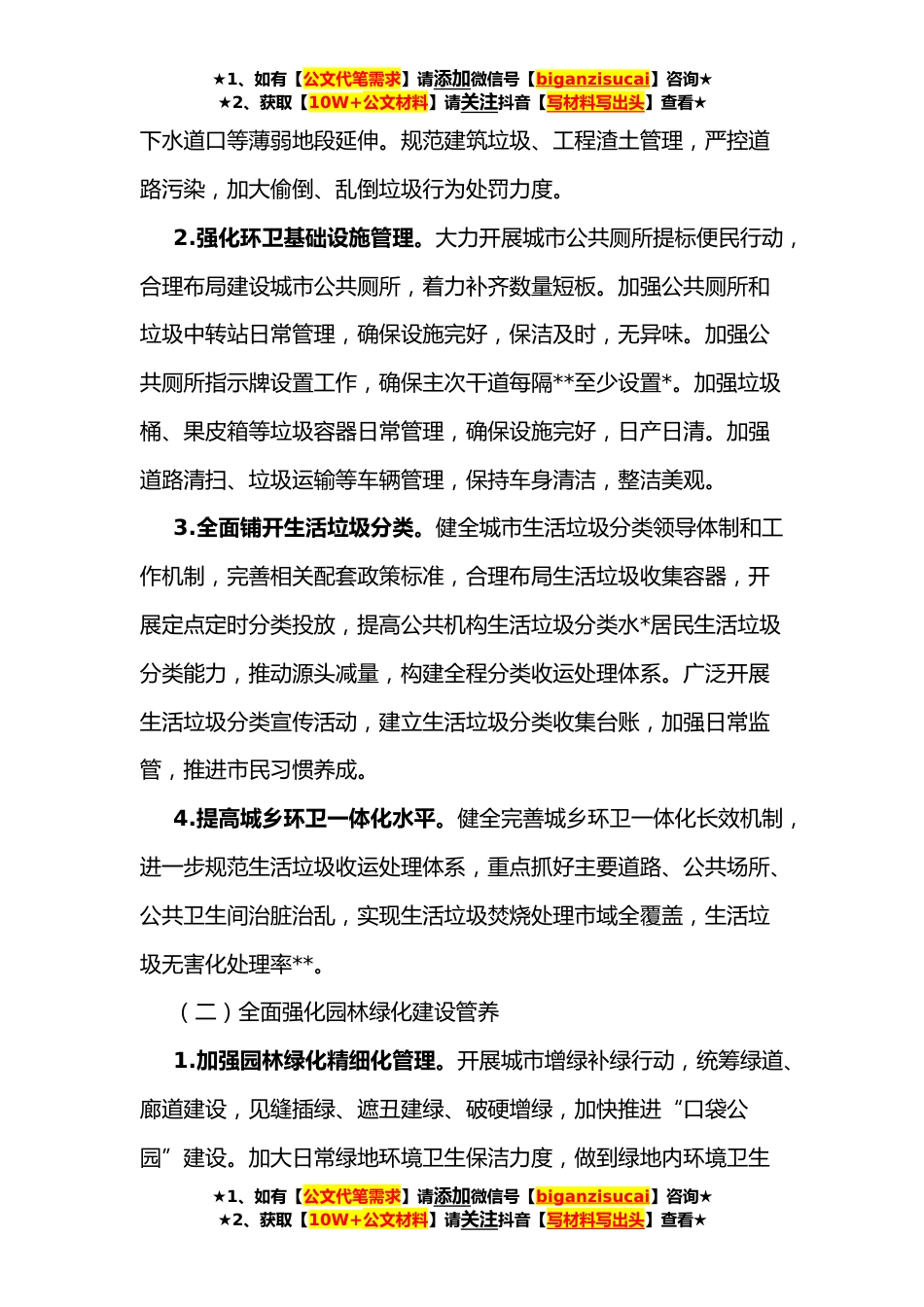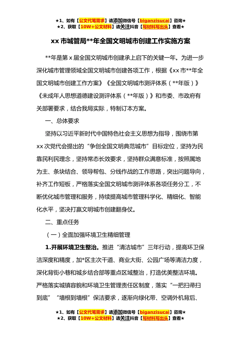 ★1、如有【公文代笔需求】请添加微信号【biganzisucai】咨询★★2、获取【10W+公文材料】请关注抖音【写材料写出头】查看★xx市城管局**年全国文明城市创建工作实施方案**年是第x届全国文明城市创建承上启下的关键一年。为进一步深化城市管理领域全国文明城市创建各项工作,根据《xx市**年全国文明城市创建工作方案》《全国文明城市测评体系(**年版)》《未成年人思想道德建设测评体系(**年版)》和市委、市政府有关部署要求,结合我局实际,特制订本方案。一、总体要求坚持以习近平新时代中国特色社会主义思想为指导,围绕市第xx次党代会提出的“争创全国文明典范城市”目标定位,坚持为民靠民利民理念,坚持常态长效要求,坚持群众满意标准,按照属地为主、条块结合、领导帮包、分线作战的工作思路,突出问题...
