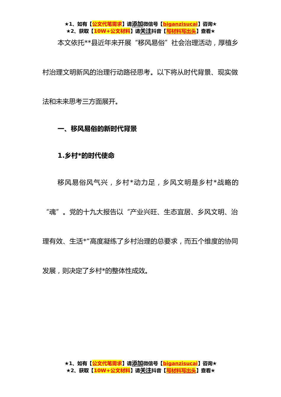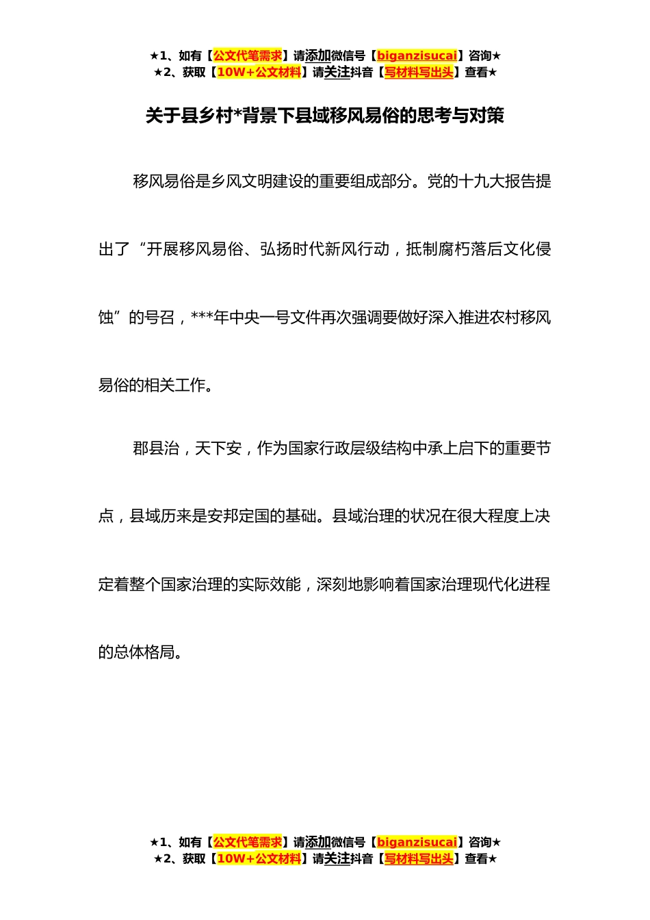 ★1、如有【公文代笔需求】请添加微信号【biganzisucai】咨询★★2、获取【10W+公文材料】请关注抖音【写材料写出头】查看★关于县乡村*背景下县域移风易俗的思考与对策移风易俗是乡风文明建设的重要组成部分。党的十九大报告提出了“开展移风易俗、弘扬时代新风行动,抵制腐朽落后文化侵蚀”的号召,***年中央一号文件再次强调要做好深入推进农村移风易俗的相关工作。郡县治,天下安,作为国家行政层级结构中承上启下的重要节点,县域历来是安邦定国的基础。县域治理的状况在很大程度上决定着整个国家治理的实际效能,深刻地影响着国家治理现代化进程的总体格局。★1、如有【公文代笔需求】请添加微信号【biganzisucai】咨询★★2、获取【10W+公文材料】请关注抖音【写材料写出头】查看★★1、如有【公文代笔需求...