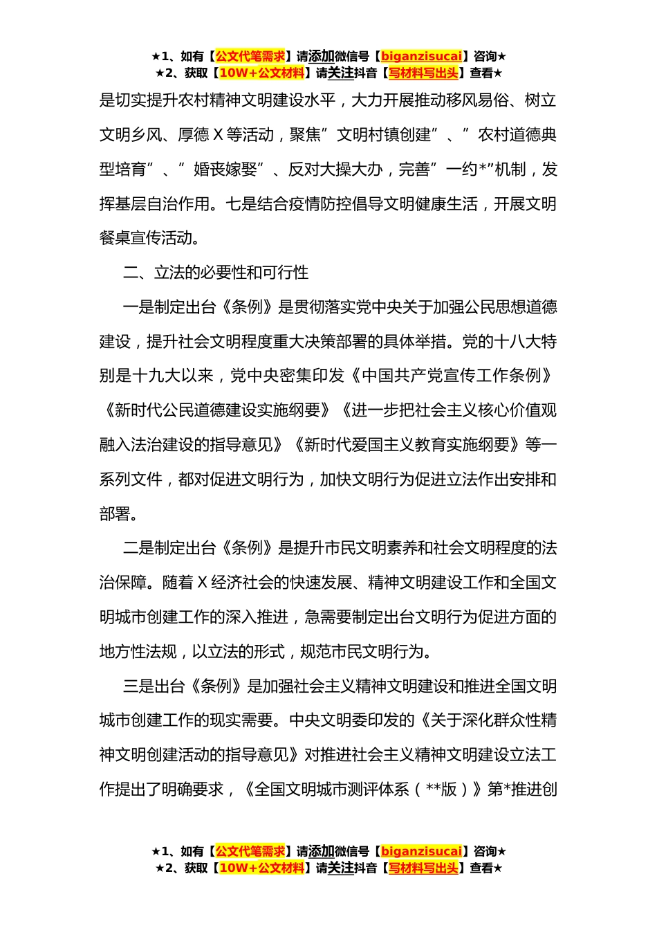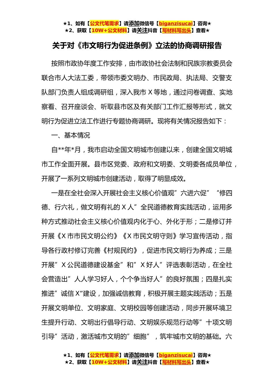 ★1、如有【公文代笔需求】请添加微信号【biganzisucai】咨询★★2、获取【10W+公文材料】请关注抖音【写材料写出头】查看★关于对《市文明行为促进条例》立法的协商调研报告按照市政协年度工作安排,由市政协社会法制和民族宗教委员会联合市人大法工委,带领市委文明办、市民政局、执法局、交警支队部门负责人组成调研组,深入我市X等地,通过问卷调查、实地察看、召开座谈会、听取县市区及有关部门工作汇报等形式,就文明行为促进立法工作进行专题协商调研。现将有关情况报告如下:一、基本情况自**年*月,我市启动全国文明城市创建以来,创建全国文明城市工作全面开展。县市区党委、政府和文明委、文明委各成员单位,开展了一系列文明城市创建活动,取得了明显成效。一是在全社会深入开展社会主义核心价值观”...