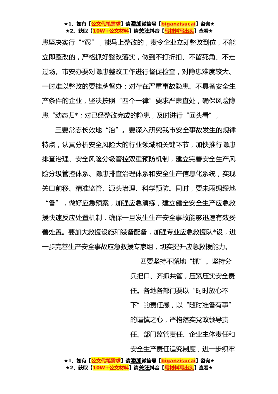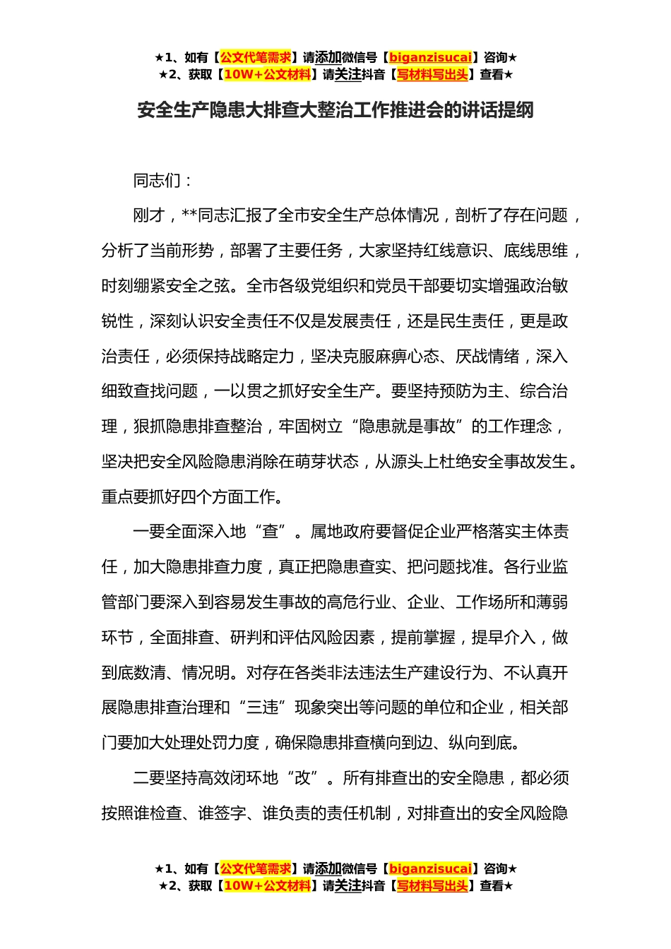 ★1、如有【公文代笔需求】请添加微信号【biganzisucai】咨询★★2、获取【10W+公文材料】请关注抖音【写材料写出头】查看★安全生产隐患大排查大整治工作推进会的讲话提纲同志们:刚才,**同志汇报了全市安全生产总体情况,剖析了存在问题,分析了当前形势,部署了主要任务,大家坚持红线意识、底线思维,时刻绷紧安全之弦。全市各级党组织和党员干部要切实增强政治敏锐性,深刻认识安全责任不仅是发展责任,还是民生责任,更是政治责任,必须保持战略定力,坚决克服麻痹心态、厌战情绪,深入细致查找问题,一以贯之抓好安全生产。要坚持预防为主、综合治理,狠抓隐患排查整治,牢固树立“隐患就是事故”的工作理念,坚决把安全风险隐患消除在萌芽状态,从源头上杜绝安全事故发生。重点要抓好四个方面工作。一要...