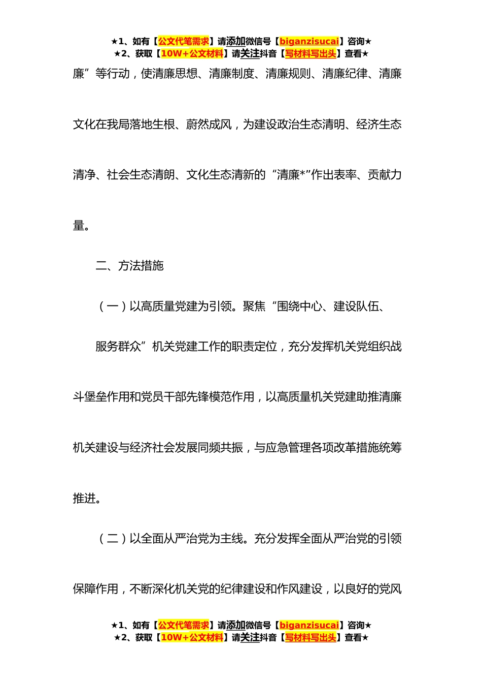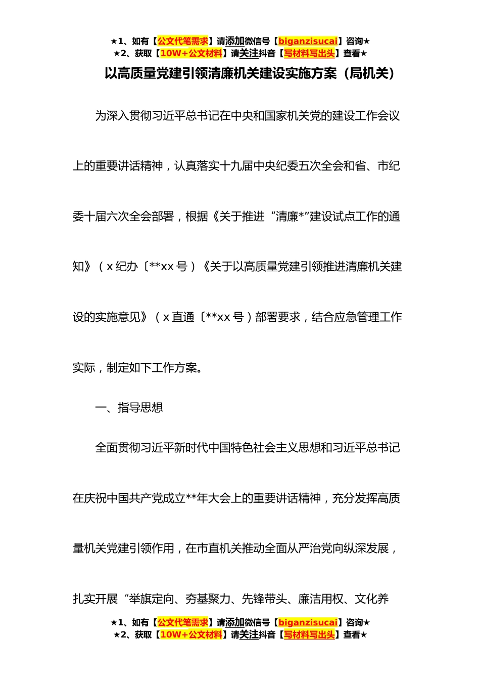 ★1、如有【公文代笔需求】请添加微信号【biganzisucai】咨询★★2、获取【10W+公文材料】请关注抖音【写材料写出头】查看★以高质量党建引领清廉机关建设实施方案(局机关)为深入贯彻习近平总书记在中央和国家机关党的建设工作会议上的重要讲话精神,认真落实十九届中央纪委五次全会和省、市纪委十届六次全会部署,根据《关于推进“清廉*”建设试点工作的通知》(x纪办〔**xx号)《关于以高质量党建引领推进清廉机关建设的实施意见》(x直通〔**xx号)部署要求,结合应急管理工作实际,制定如下工作方案。一、指导思想全面贯彻习近平新时代中国特色社会主义思想和习近平总书记在庆祝中国共产党成立**年大会上的重要讲话精神,充分发挥高质量机关党建引领作用,在市直机关推动全面从严治党向纵深发展,扎实开展“...