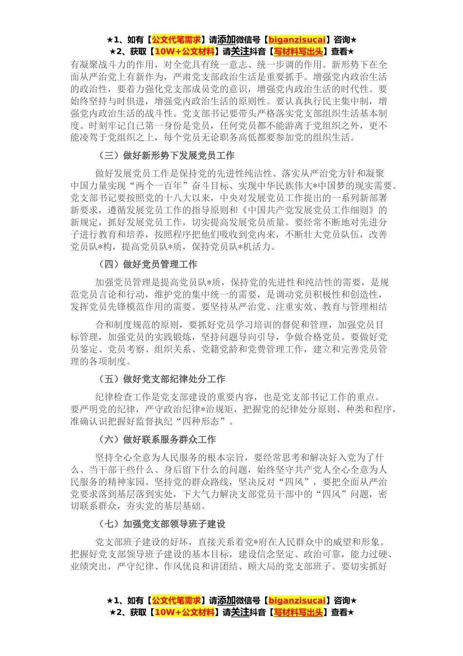 ★1、如有【公文代笔需求】请添加微信号【biganzisucai】咨询★★2、获取【10W+公文材料】请关注抖音【写材料写出头】查看★党支部书记是支部的带头人,也是支部落实全面从严治党要求的第一责任人。全面从严治党的各项制度措施落实得如何,关键取决于支部书记的责任意识、担当精神和素质能力。一、党支部书记的主要职责《中国共产党支部工作条例(试行)》规定:“党支部书记主持党支部全面工作,督促党支部其他委员履行职责、发挥作用,抓好党支部委员会自身建设,向党支部委员会、党员大会和上级党组织报告工作。其主要职责有七方面:包括负责召集支部委员会和支部大会,认真完成上级党委和支部大会提出的各项任务;做好经常性的思想政治工作;认真做好党的政治建设、思想建设、组织建设、作风建设、纪律建设;...