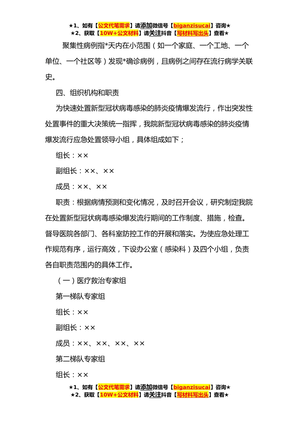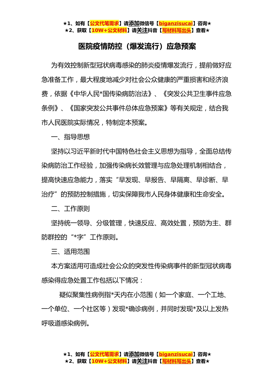 ★1、如有【公文代笔需求】请添加微信号【biganzisucai】咨询★★2、获取【10W+公文材料】请关注抖音【写材料写出头】查看★医院疫情防控(爆发流行)应急预案为有效控制新型冠状病毒感染的肺炎疫情爆发流行,提前做好应急准备工作,最大程度地减少对社会公众健康的严重损害和经济浪费,依据《中华人民*国传染病防治法》、《突发公共卫生事件应急条例》、《国家突发公共事件总体应急预案》等有关规定,结合我市人民医院实际情况,特制定本预案。一、指导思想坚持以习近平新时代中国特色社会主义思想为指导,全面总结传染病防治工作经验,加强传染病长效管理与应急处理机制相结合,提高快速应急能力,落实“早发现、早报告、早隔离、早诊断、早治疗”的预防控制措施,切实保障我市人民身体健康和生命安全。二、工作...