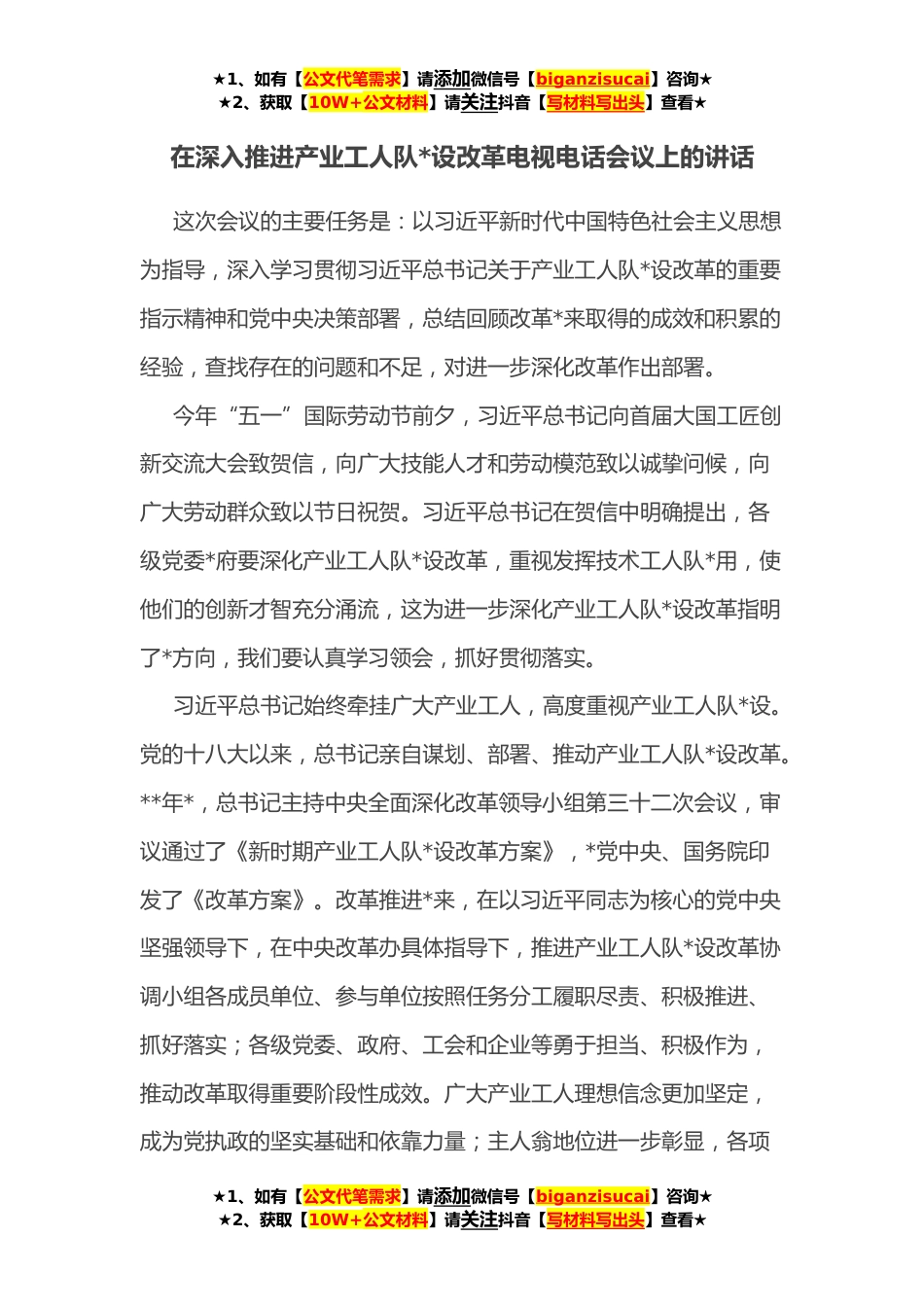 ★1、如有【公文代笔需求】请添加微信号【biganzisucai】咨询★★2、获取【10W+公文材料】请关注抖音【写材料写出头】查看★在深入推进产业工人队*设改革电视电话会议上的讲话这次会议的主要任务是:以习近平新时代中国特色社会主义思想为指导,深入学习贯彻习近平总书记关于产业工人队*设改革的重要指示精神和党中央决策部署,总结回顾改革*来取得的成效和积累的经验,查找存在的问题和不足,对进一步深化改革作出部署。今年“五一”国际劳动节前夕,习近平总书记向首届大国工匠创新交流大会致贺信,向广大技能人才和劳动模范致以诚挚问候,向广大劳动群众致以节日祝贺。习近平总书记在贺信中明确提出,各级党委*府要深化产业工人队*设改革,重视发挥技术工人队*用,使他们的创新才智充分涌流,这为进一步深化产...