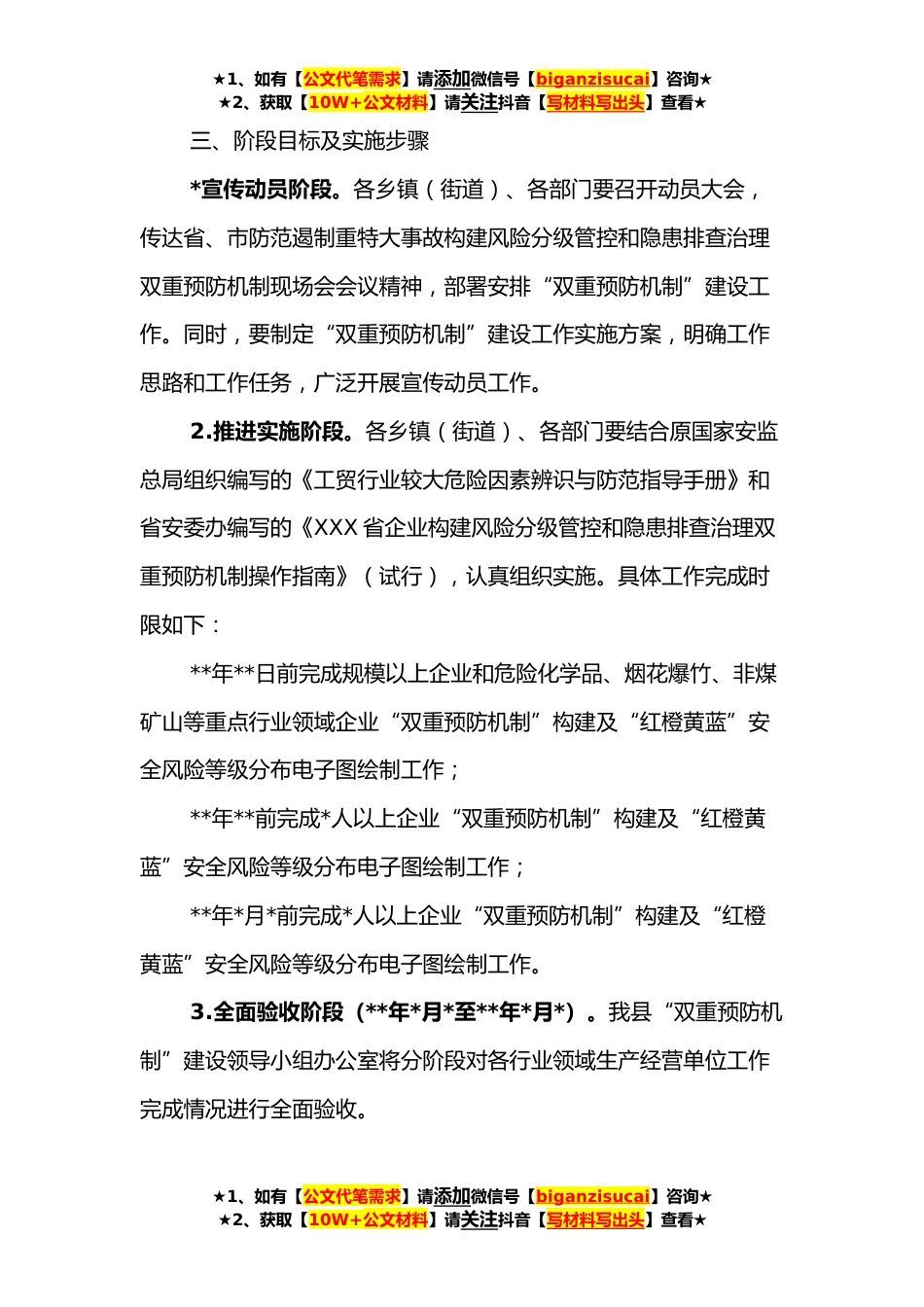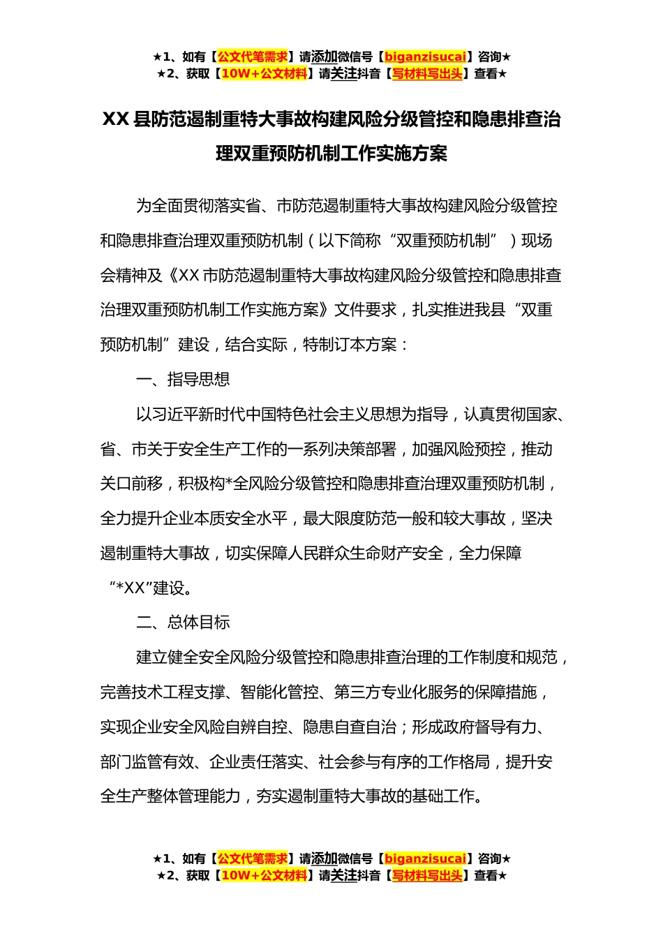 ★1、如有【公文代笔需求】请添加微信号【biganzisucai】咨询★★2、获取【10W+公文材料】请关注抖音【写材料写出头】查看★XX县防范遏制重特大事故构建风险分级管控和隐患排查治理双重预防机制工作实施方案为全面贯彻落实省、市防范遏制重特大事故构建风险分级管控和隐患排查治理双重预防机制(以下简称“双重预防机制”)现场会精神及《XX市防范遏制重特大事故构建风险分级管控和隐患排查治理双重预防机制工作实施方案》文件要求,扎实推进我县“双重预防机制”建设,结合实际,特制订本方案:一、指导思想以习近平新时代中国特色社会主义思想为指导,认真贯彻国家、省、市关于安全生产工作的一系列决策部署,加强风险预控,推动关口前移,积极构*全风险分级管控和隐患排查治理双重预防机制,全力提升企业本质安...