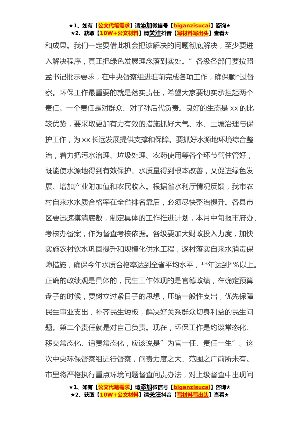 ★1、如有【公文代笔需求】请添加微信号【biganzisucai】咨询★★2、获取【10W+公文材料】请关注抖音【写材料写出头】查看★在全市**年民生项目重点项目推进会议上的讲话根据年初市委、市政府的工作安排,我们开展了这次全市民生项目观摩活动。今天下午召开会议,主要是进一步统一思想认识,动员全市各级各部门按照”六个持续”的要求深入推进各项民生事业发展。刚才,xx同志和xx同志对环境保护、全域旅游、品牌建设、食品安全、商事制度改革等几项重要工作进行了专题安排部署,各级各部门要凝心聚力抓落实,争先恐后比成效。全市各级各部门特别是各县市区要相互学习借鉴、取长补短,进一步增强做好民生工作的积极性与主动性,不断提高辖区内民生工作水平。关于环境保护、全域旅游、品牌建设、食品安全、商事制度...