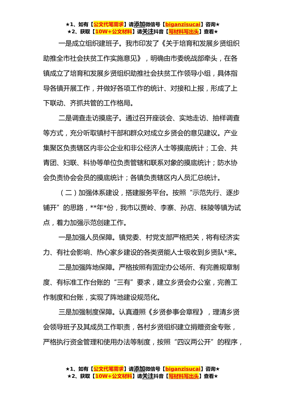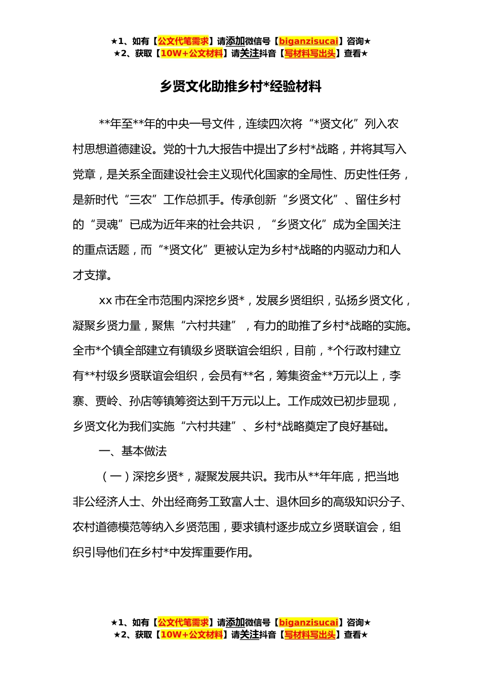 ★1、如有【公文代笔需求】请添加微信号【biganzisucai】咨询★★2、获取【10W+公文材料】请关注抖音【写材料写出头】查看★乡贤文化助推乡村*经验材料**年至**年的中央一号文件,连续四次将“*贤文化”列入农村思想道德建设。党的十九大报告中提出了乡村*战略,并将其写入党章,是关系全面建设社会主义现代化国家的全局性、历史性任务,是新时代“三农”工作总抓手。传承创新“乡贤文化”、留住乡村的“灵魂”已成为近年来的社会共识,“乡贤文化”成为全国关注的重点话题,而“*贤文化”更被认定为乡村*战略的内驱动力和人才支撑。xx市在全市范围内深挖乡贤*,发展乡贤组织,弘扬乡贤文化,凝聚乡贤力量,聚焦“六村共建”,有力的助推了乡村*战略的实施。全市*个镇全部建立有镇级乡贤联谊会组织,目前,*个行政...