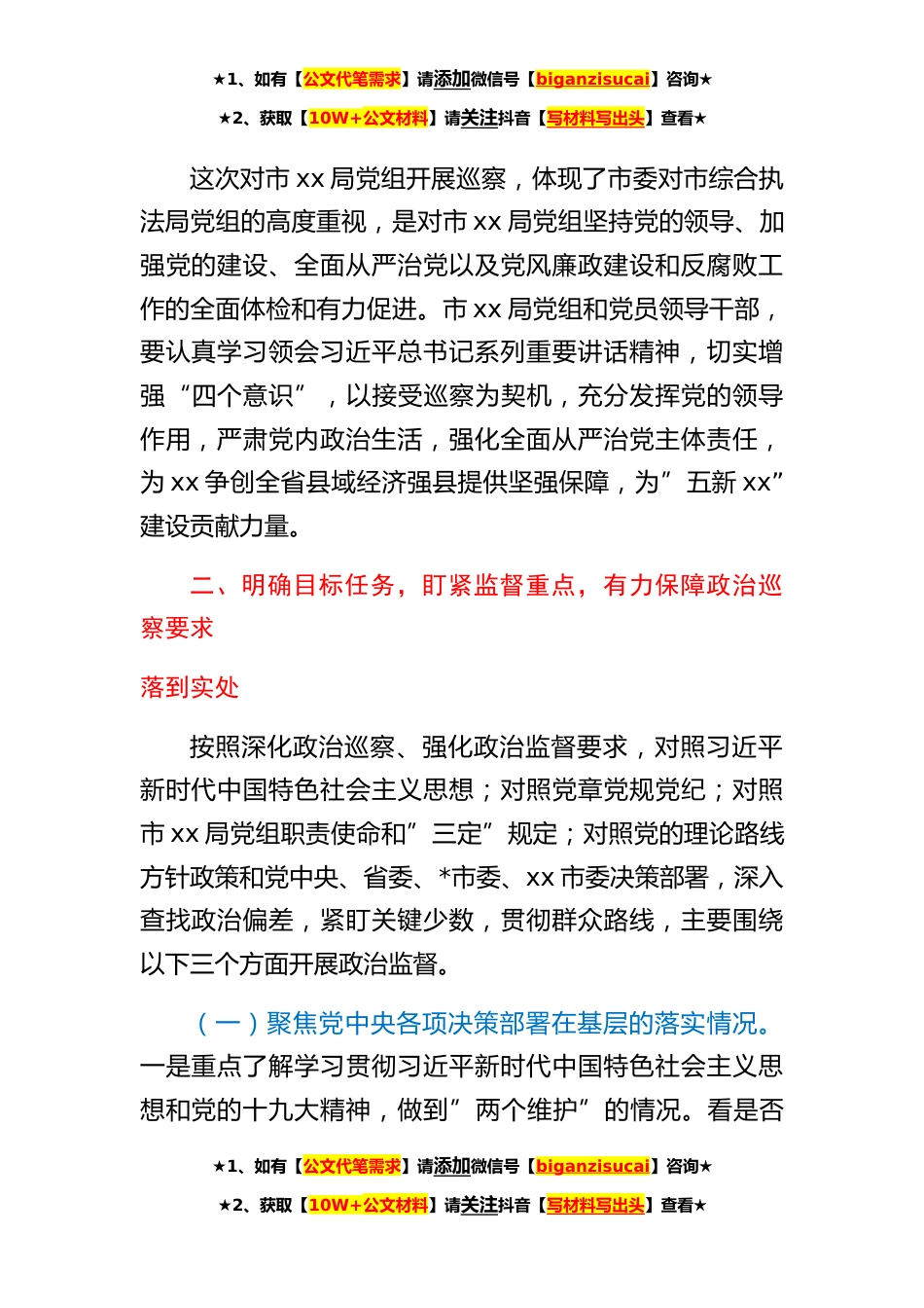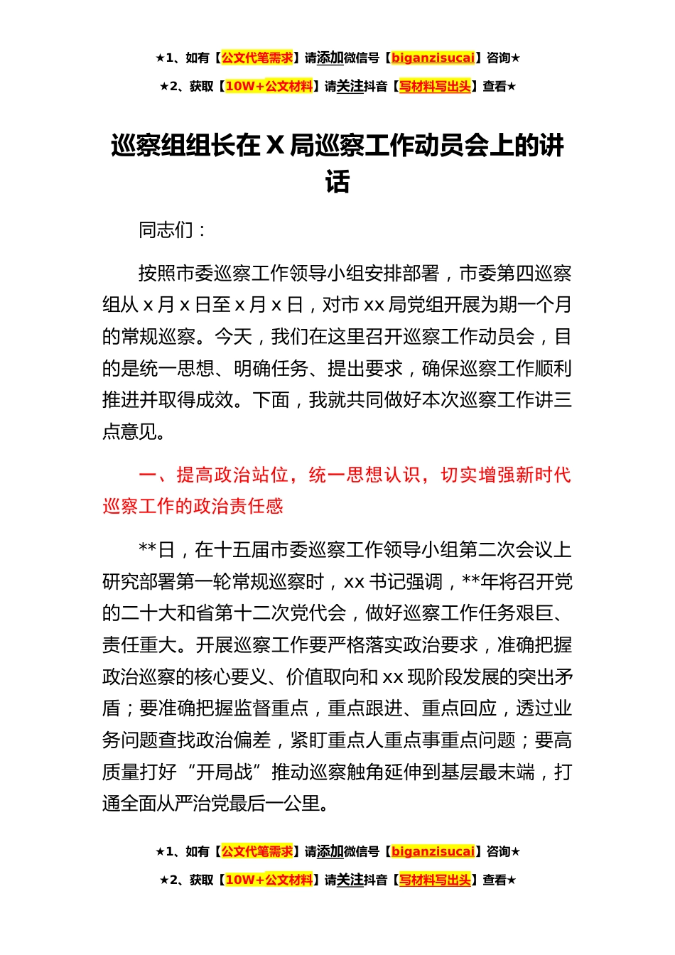 ★1、如有【公文代笔需求】请添加微信号【biganzisucai】咨询★★2、获取【10W+公文材料】请关注抖音【写材料写出头】查看★巡察组组长在X局巡察工作动员会上的讲话同志们:按照市委巡察工作领导小组安排部署,市委第四巡察组从x月x日至x月x日,对市xx局党组开展为期一个月的常规巡察。今天,我们在这里召开巡察工作动员会,目的是统一思想、明确任务、提出要求,确保巡察工作顺利推进并取得成效。下面,我就共同做好本次巡察工作讲三点意见。一、提高政治站位,统一思想认识,切实增强新时代巡察工作的政治责任感**日,在十五届市委巡察工作领导小组第二次会议上研究部署第一轮常规巡察时,xx书记强调,**年将召开党的二十大和省第十二次党代会,做好巡察工作任务艰巨、责任重大。开展巡察工作要严格落实政治要求...