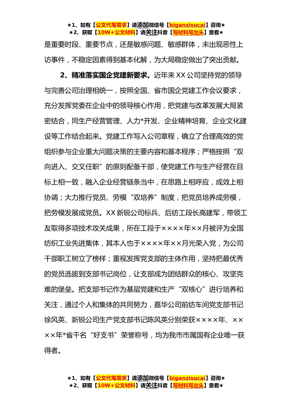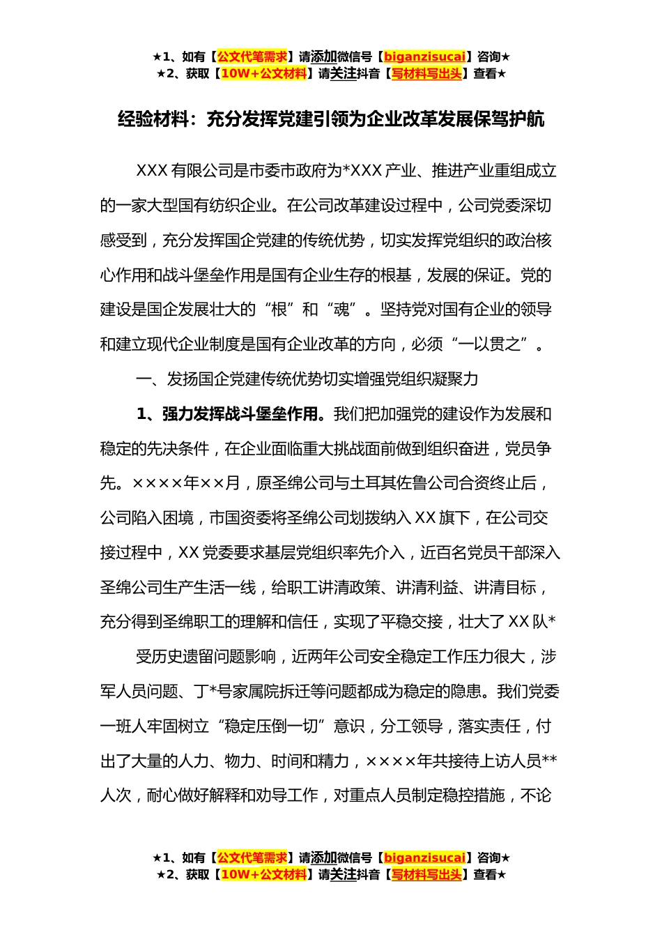 ★1、如有【公文代笔需求】请添加微信号【biganzisucai】咨询★★2、获取【10W+公文材料】请关注抖音【写材料写出头】查看★经验材料:充分发挥党建引领为企业改革发展保驾护航XXX有限公司是市委市政府为*XXX产业、推进产业重组成立的一家大型国有纺织企业。在公司改革建设过程中,公司党委深切感受到,充分发挥国企党建的传统优势,切实发挥党组织的政治核心作用和战斗堡垒作用是国有企业生存的根基,发展的保证。党的建设是国企发展壮大的“根”和“魂”。坚持党对国有企业的领导和建立现代企业制度是国有企业改革的方向,必须“一以贯之”。一、发扬国企党建传统优势切实增强党组织凝聚力1、强力发挥战斗堡垒作用。我们把加强党的建设作为发展和稳定的先决条件,在企业面临重大挑战面前做到组织奋进,党员争先...