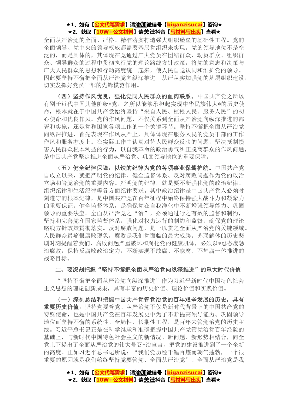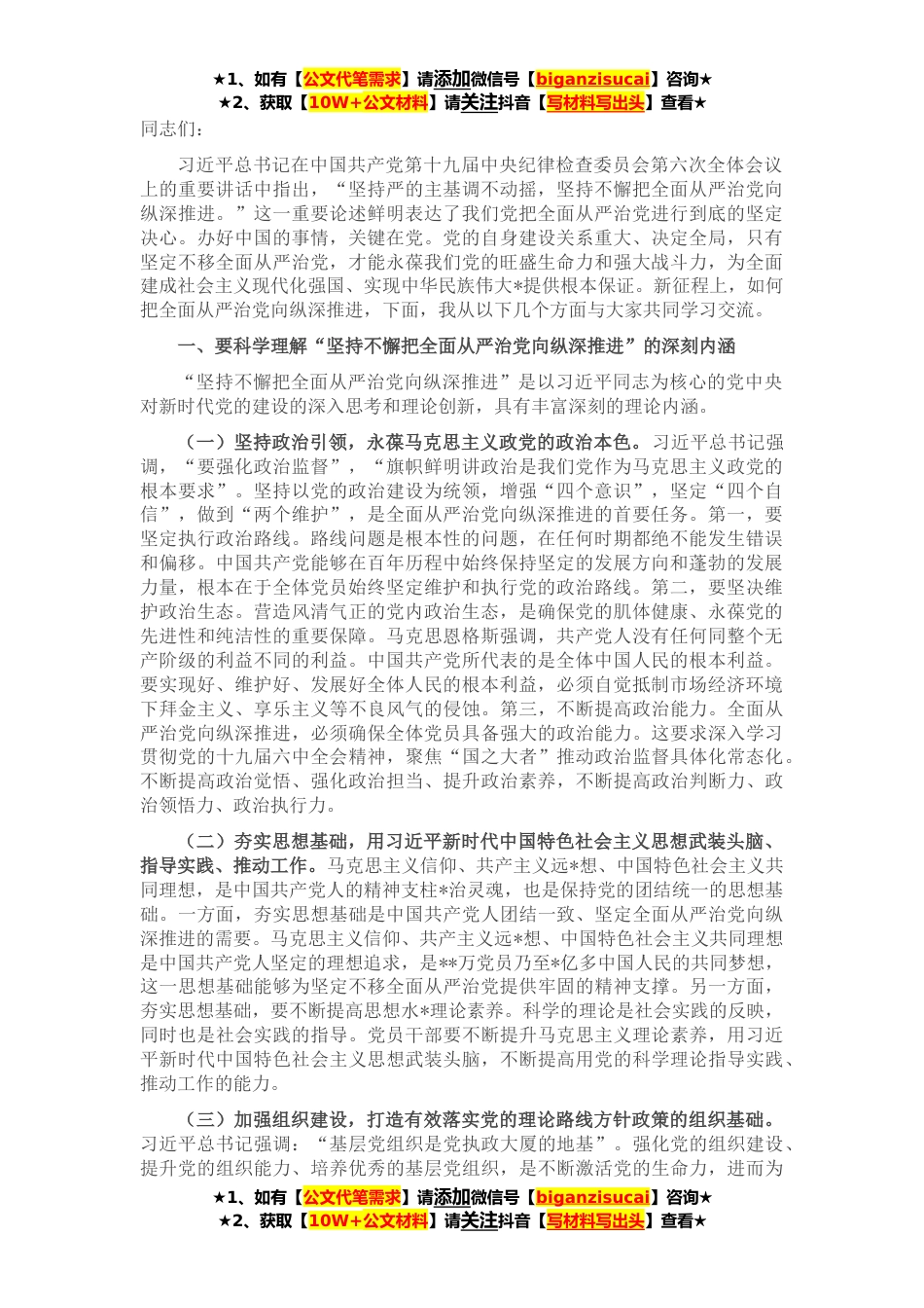 ★1、如有【公文代笔需求】请添加微信号【biganzisucai】咨询★★2、获取【10W+公文材料】请关注抖音【写材料写出头】查看★同志们:习近平总书记在中国共产党第十九届中央纪律检查委员会第六次全体会议上的重要讲话中指出,“坚持严的主基调不动摇,坚持不懈把全面从严治党向纵深推进。”这一重要论述鲜明表达了我们党把全面从严治党进行到底的坚定决心。办好中国的事情,关键在党。党的自身建设关系重大、决定全局,只有坚定不移全面从严治党,才能永葆我们党的旺盛生命力和强大战斗力,为全面建成社会主义现代化强国、实现中华民族伟大*提供根本保证。新征程上,如何把全面从严治党向纵深推进,下面,我从以下几个方面与大家共同学习交流。一、要科学理解“坚持不懈把全面从严治党向纵深推进”的深刻内涵“坚持...