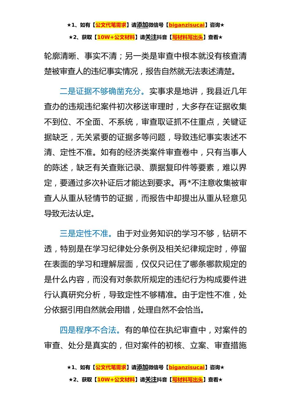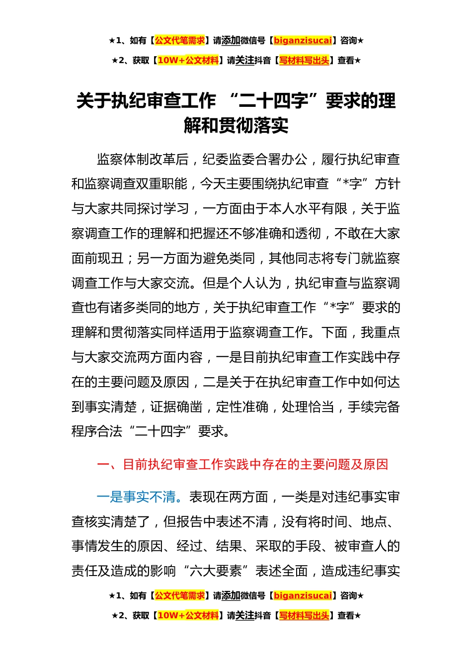 ★1、如有【公文代笔需求】请添加微信号【biganzisucai】咨询★★2、获取【10W+公文材料】请关注抖音【写材料写出头】查看★关于执纪审查工作“二十四字”要求的理解和贯彻落实监察体制改革后,纪委监委合署办公,履行执纪审查和监察调查双重职能,今天主要围绕执纪审查“*字”方针与大家共同探讨学习,一方面由于本人水平有限,关于监察调查工作的理解和把握还不够准确和透彻,不敢在大家面前现丑;另一方面为避免类同,其他同志将专门就监察调查工作与大家交流。但是个人认为,执纪审查与监察调查也有诸多类同的地方,关于执纪审查工作“*字”要求的理解和贯彻落实同样适用于监察调查工作。下面,我重点与大家交流两方面内容,一是目前执纪审查工作实践中存在的主要问题及原因,二是关于在执纪审查工作中如何达...