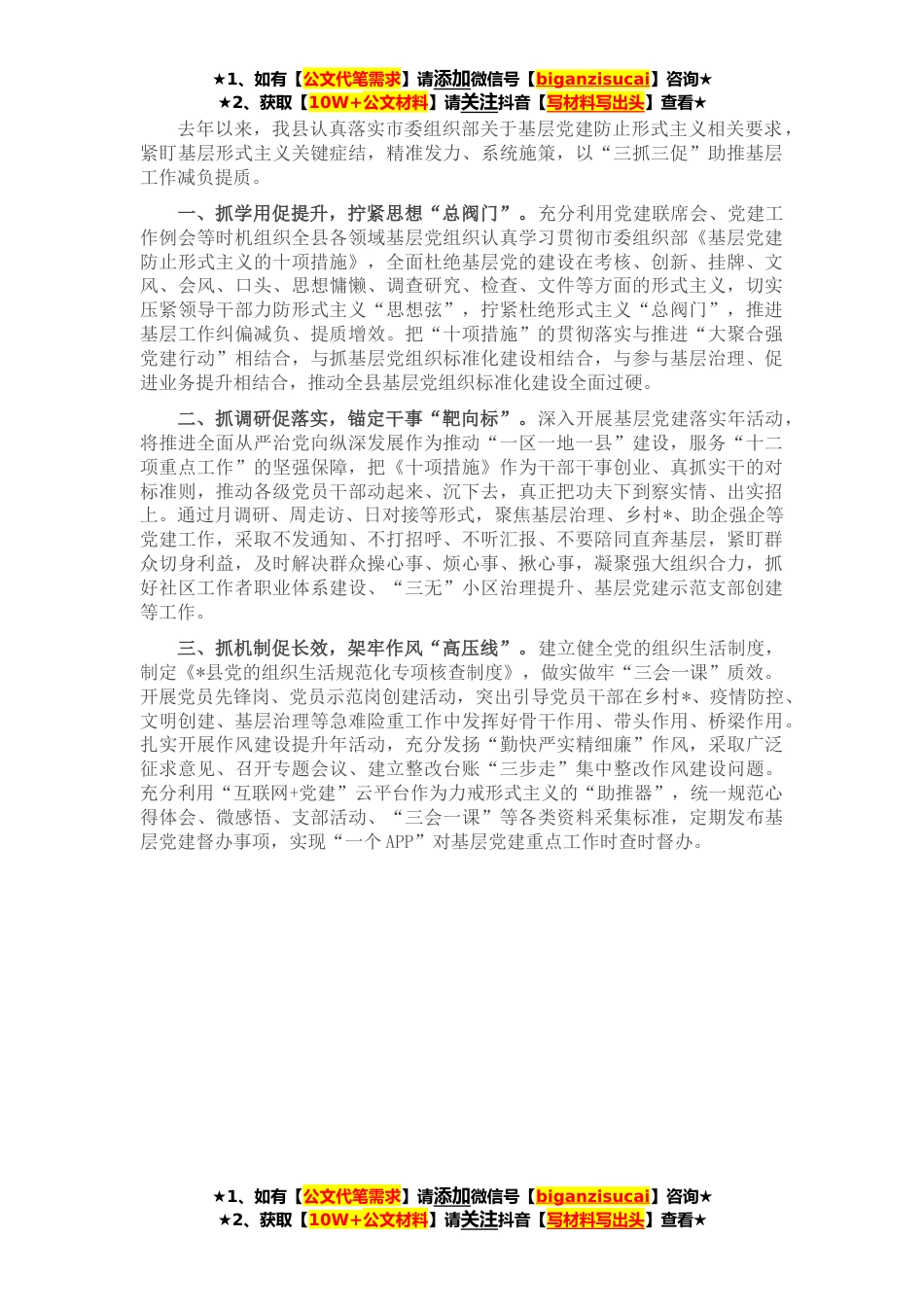 ★1、如有【公文代笔需求】请添加微信号【biganzisucai】咨询★★2、获取【10W+公文材料】请关注抖音【写材料写出头】查看★去年以来,我县认真落实市委组织部关于基层党建防止形式主义相关要求,紧盯基层形式主义关键症结,精准发力、系统施策,以“三抓三促”助推基层工作减负提质。一、抓学用促提升,拧紧思想“总阀门”。充分利用党建联席会、党建工作例会等时机组织全县各领域基层党组织认真学习贯彻市委组织部《基层党建防止形式主义的十项措施》,全面杜绝基层党的建设在考核、创新、挂牌、文风、会风、口头、思想慵懒、调查研究、检查、文件等方面的形式主义,切实压紧领导干部力防形式主义“思想弦”,拧紧杜绝形式主义“总阀门”,推进基层工作纠偏减负、提质增效。把“十项措施”的贯彻落实与推进“大...