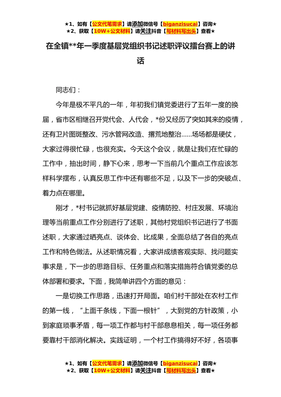 ★1、如有【公文代笔需求】请添加微信号【biganzisucai】咨询★★2、获取【10W+公文材料】请关注抖音【写材料写出头】查看★在全镇**年一季度基层党组织书记述职评议擂台赛上的讲话同志们:今年是极不平凡的一年,年初我们镇党委进行了五年一度的换届,省市区相继召开党代会、人代会,*份又经历了突如其来的疫情,还有卫片图斑整改、污水管网改造、撂荒地整治……场场都是硬仗,大家过得很忙碌,也很充实。今天这个会议,就是让我们在忙碌的工作中,抽出时间,静下心来,思考一下当前几个重点工作应该怎样科学摆布,认真反思工作中还有哪些不足,以及下一步的突破点、着力点在哪里。刚才,*村书记就抓好基层党建、疫情防控、村庄发展、环境治理等当前重点工作分别进行了述职,其他村党组织书记进行了书面述职,大...