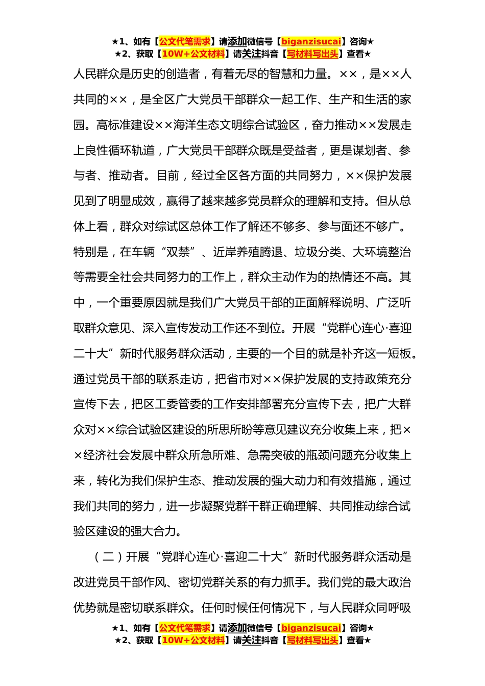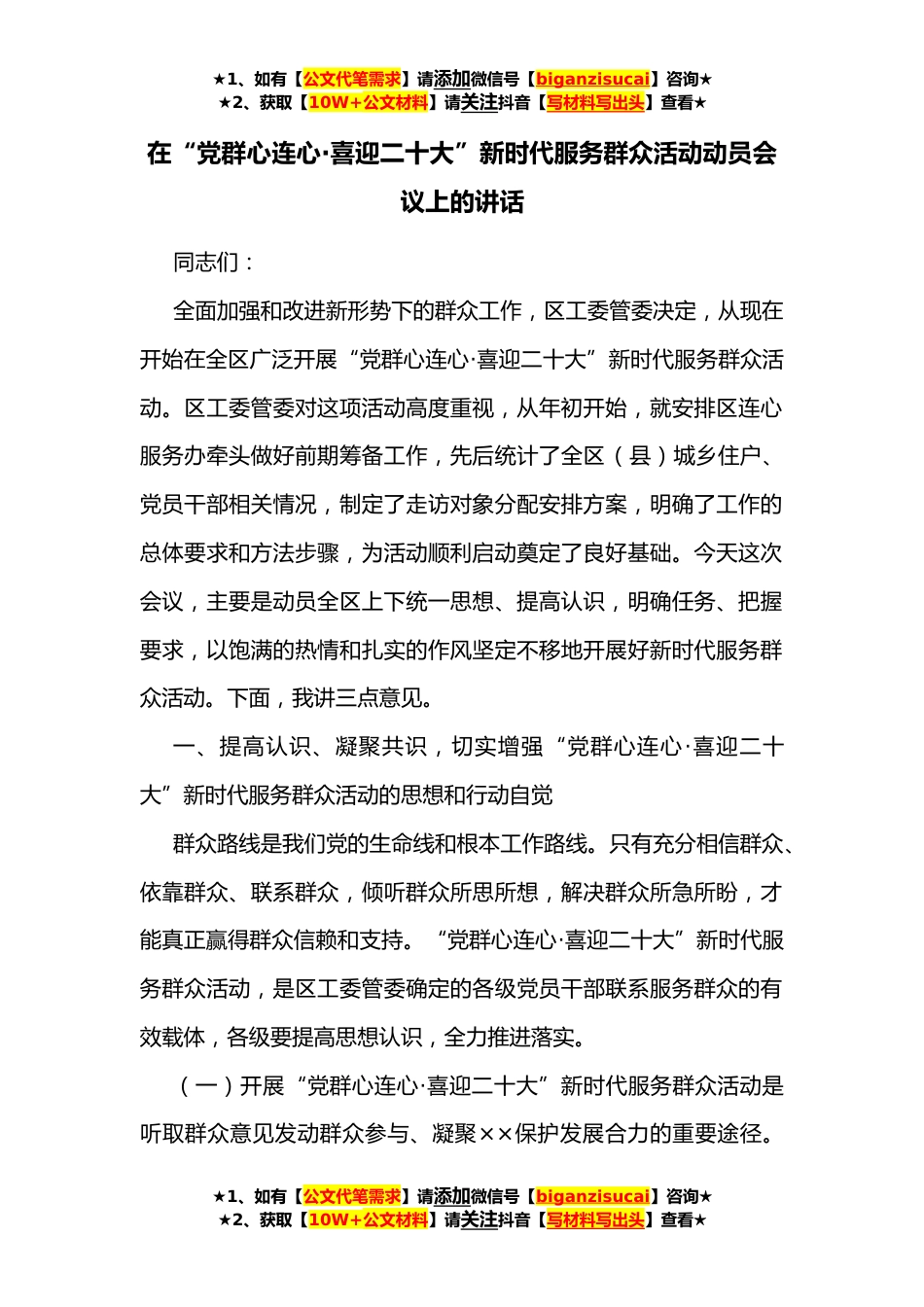 ★1、如有【公文代笔需求】请添加微信号【biganzisucai】咨询★★2、获取【10W+公文材料】请关注抖音【写材料写出头】查看★在“党群心连心·喜迎二十大”新时代服务群众活动动员会议上的讲话同志们:全面加强和改进新形势下的群众工作,区工委管委决定,从现在开始在全区广泛开展“党群心连心·喜迎二十大”新时代服务群众活动。区工委管委对这项活动高度重视,从年初开始,就安排区连心服务办牵头做好前期筹备工作,先后统计了全区(县)城乡住户、党员干部相关情况,制定了走访对象分配安排方案,明确了工作的总体要求和方法步骤,为活动顺利启动奠定了良好基础。今天这次会议,主要是动员全区上下统一思想、提高认识,明确任务、把握要求,以饱满的热情和扎实的作风坚定不移地开展好新时代服务群众活动。下面...