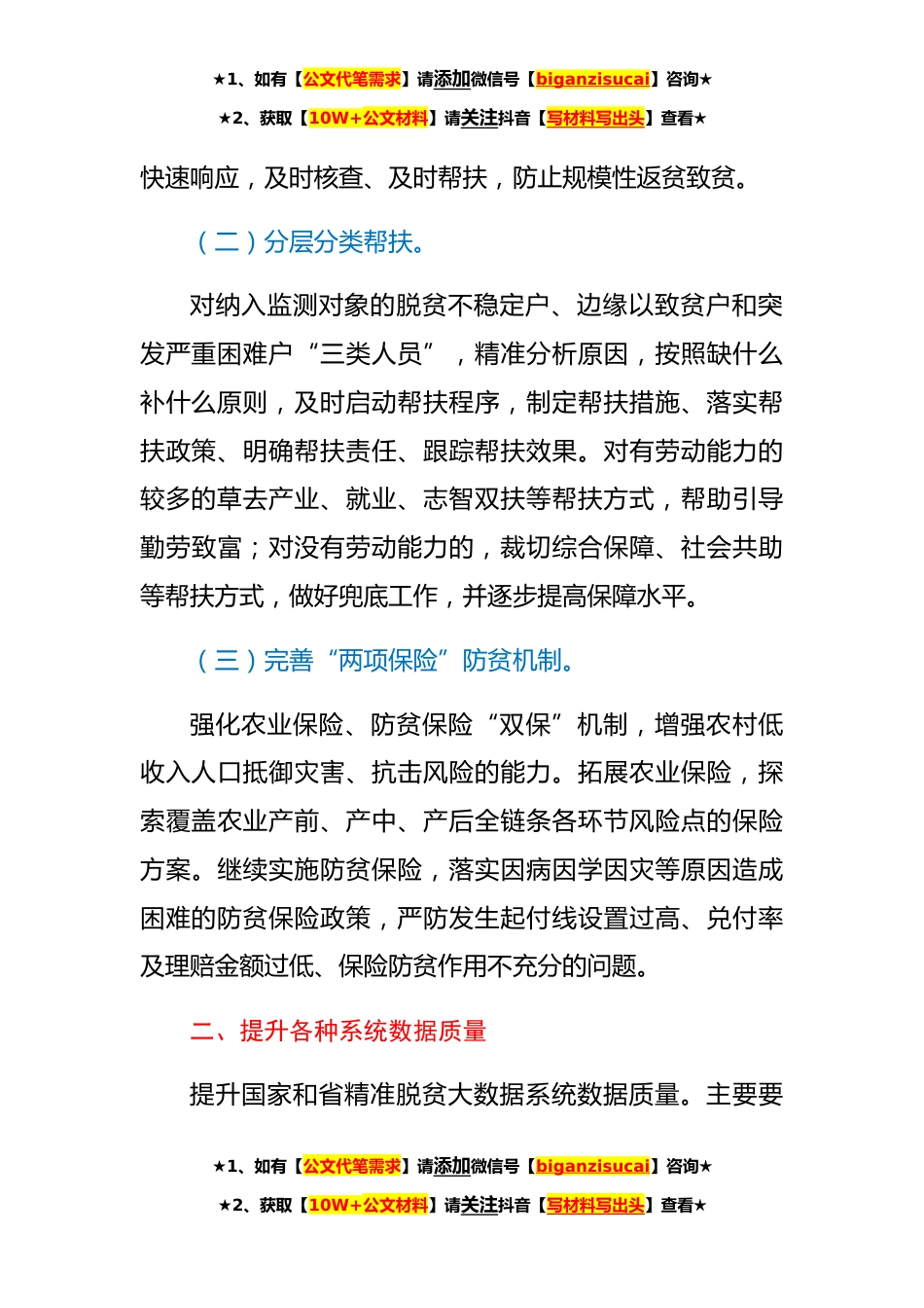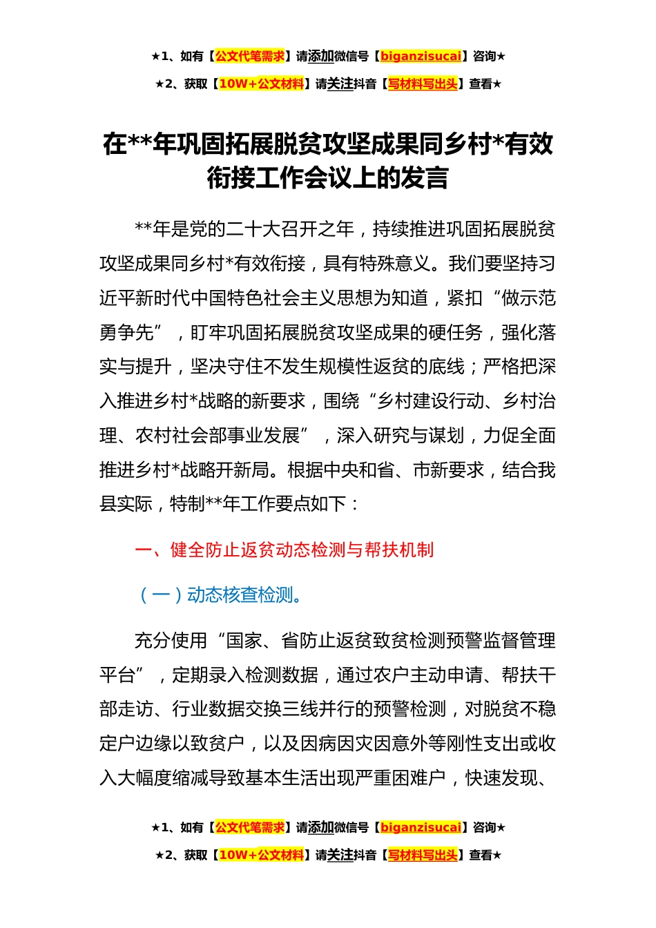★1、如有【公文代笔需求】请添加微信号【biganzisucai】咨询★★2、获取【10W+公文材料】请关注抖音【写材料写出头】查看★在**年巩固拓展脱贫攻坚成果同乡村*有效衔接工作会议上的发言**年是党的二十大召开之年,持续推进巩固拓展脱贫攻坚成果同乡村*有效衔接,具有特殊意义。我们要坚持习近平新时代中国特色社会主义思想为知道,紧扣“做示范勇争先”,盯牢巩固拓展脱贫攻坚成果的硬任务,强化落实与提升,坚决守住不发生规模性返贫的底线;严格把深入推进乡村*战略的新要求,围绕“乡村建设行动、乡村治理、农村社会部事业发展”,深入研究与谋划,力促全面推进乡村*战略开新局。根据中央和省、市新要求,结合我县实际,特制**年工作要点如下:一、健全防止返贫动态检测与帮扶机制(一)动态核查检测。充分使...