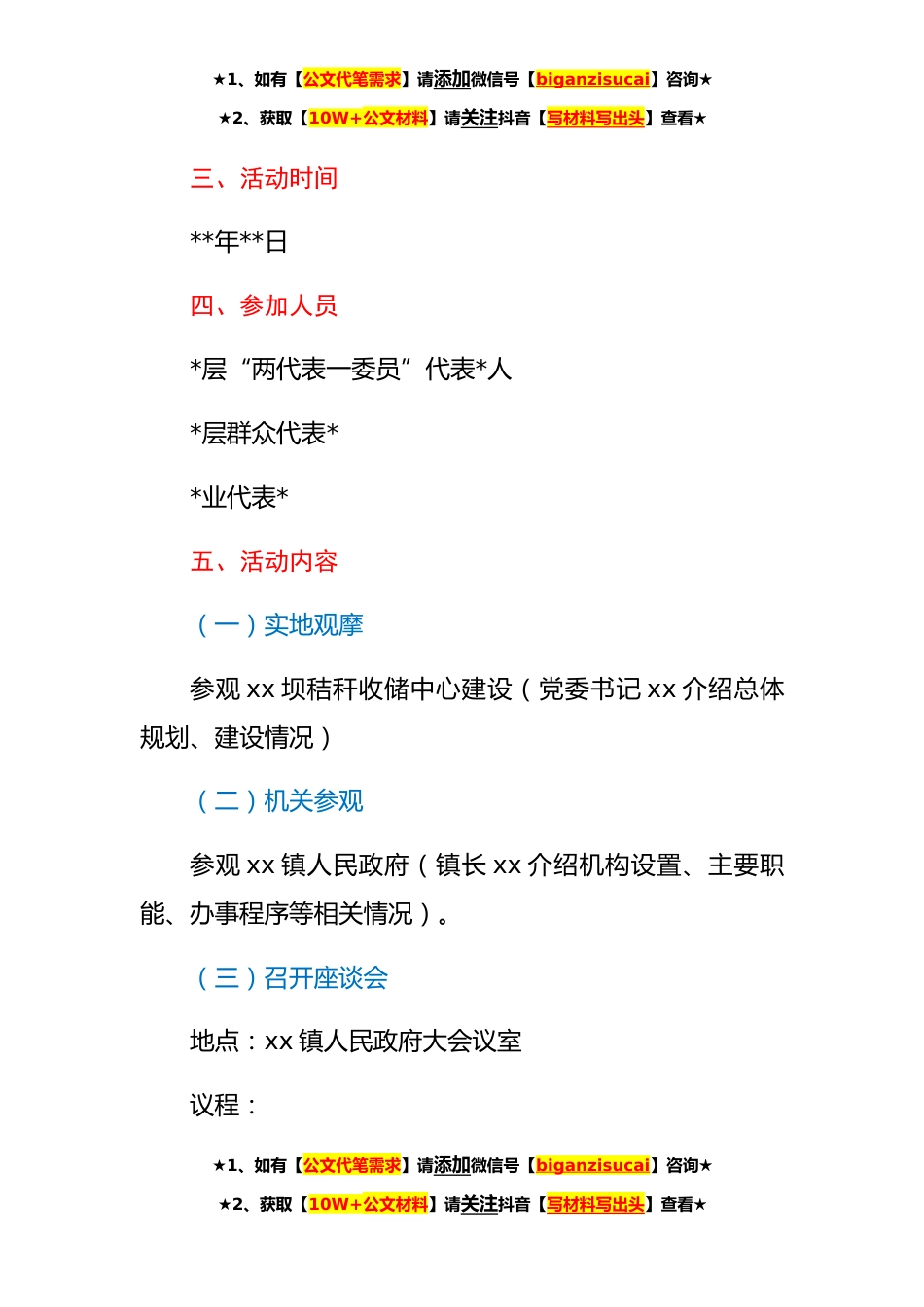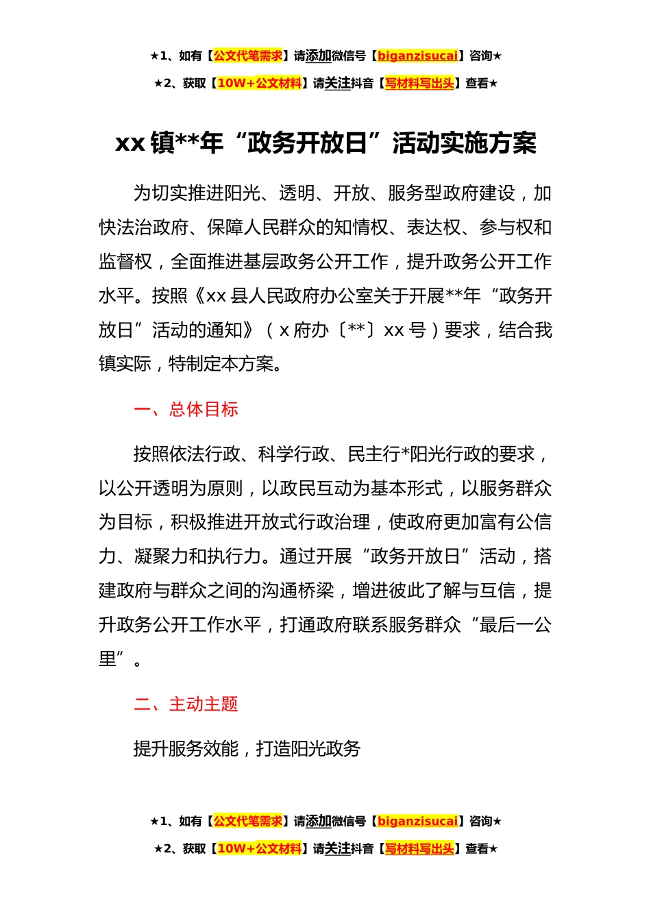 ★1、如有【公文代笔需求】请添加微信号【biganzisucai】咨询★★2、获取【10W+公文材料】请关注抖音【写材料写出头】查看★xx镇**年“政务开放日”活动实施方案为切实推进阳光、透明、开放、服务型政府建设,加快法治政府、保障人民群众的知情权、表达权、参与权和监督权,全面推进基层政务公开工作,提升政务公开工作水平。按照《xx县人民政府办公室关于开展**年“政务开放日”活动的通知》(x府办〔**〕xx号)要求,结合我镇实际,特制定本方案。一、总体目标按照依法行政、科学行政、民主行*阳光行政的要求,以公开透明为原则,以政民互动为基本形式,以服务群众为目标,积极推进开放式行政治理,使政府更加富有公信力、凝聚力和执行力。通过开展“政务开放日”活动,搭建政府与群众之间的沟通桥梁,增进彼此...