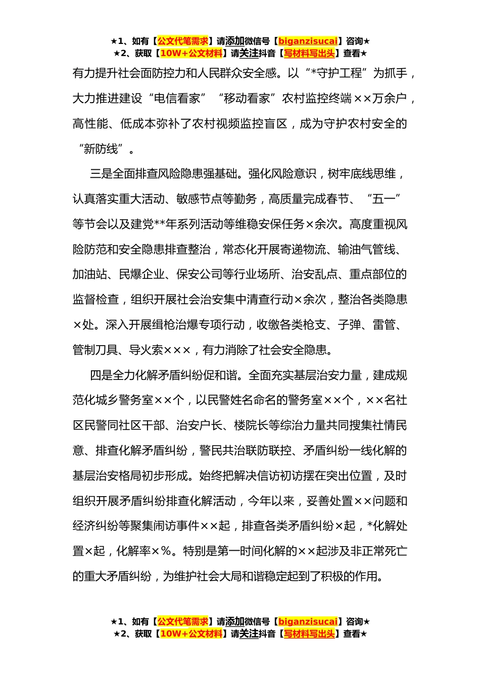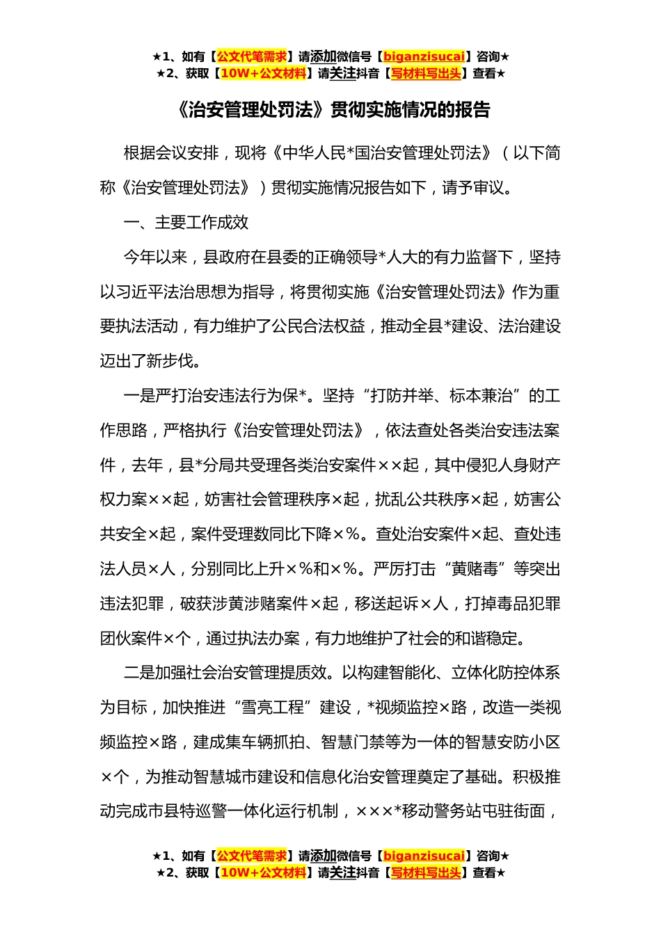 ★1、如有【公文代笔需求】请添加微信号【biganzisucai】咨询★★2、获取【10W+公文材料】请关注抖音【写材料写出头】查看★《治安管理处罚法》贯彻实施情况的报告根据会议安排,现将《中华人民*国治安管理处罚法》(以下简称《治安管理处罚法》)贯彻实施情况报告如下,请予审议。一、主要工作成效今年以来,县政府在县委的正确领导*人大的有力监督下,坚持以习近平法治思想为指导,将贯彻实施《治安管理处罚法》作为重要执法活动,有力维护了公民合法权益,推动全县*建设、法治建设迈出了新步伐。一是严打治安违法行为保*。坚持“打防并举、标本兼治”的工作思路,严格执行《治安管理处罚法》,依法查处各类治安违法案件,去年,县*分局共受理各类治安案件××起,其中侵犯人身财产权力案××起,妨害社会管理秩...