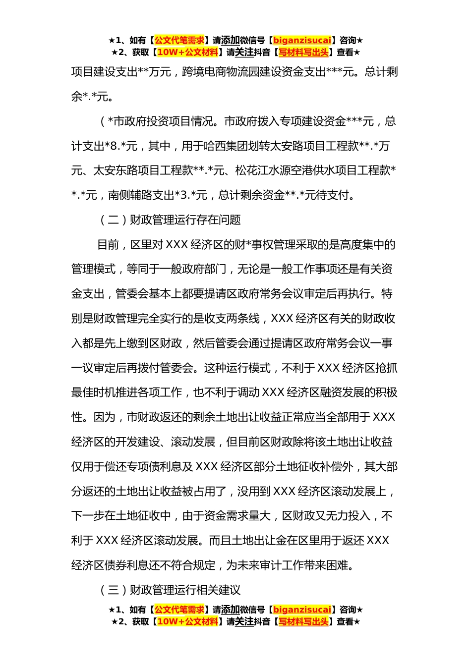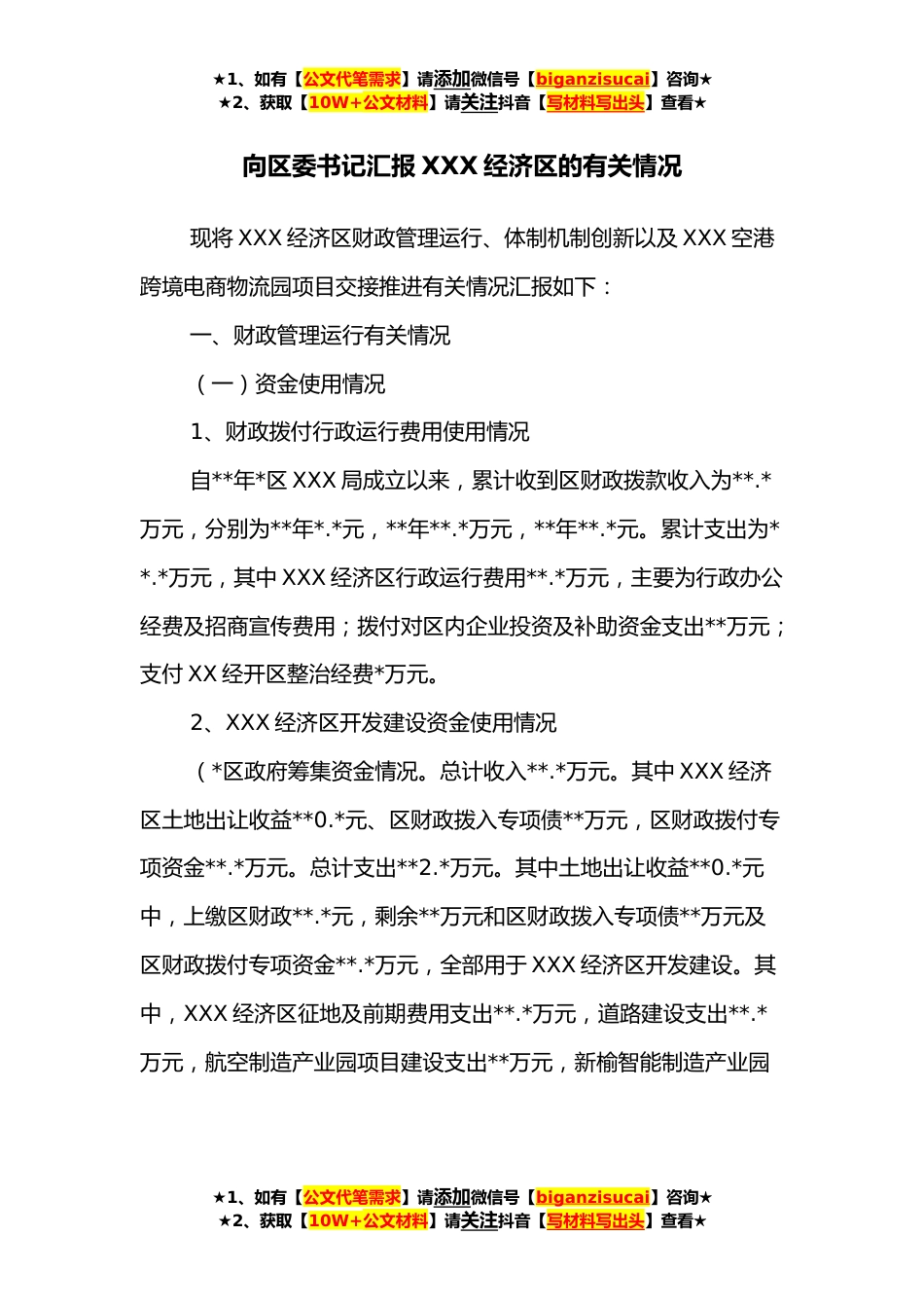 ★1、如有【公文代笔需求】请添加微信号【biganzisucai】咨询★★2、获取【10W+公文材料】请关注抖音【写材料写出头】查看★向区委书记汇报XXX经济区的有关情况现将XXX经济区财政管理运行、体制机制创新以及XXX空港跨境电商物流园项目交接推进有关情况汇报如下:一、财政管理运行有关情况(一)资金使用情况1、财政拨付行政运行费用使用情况自**年*区XXX局成立以来,累计收到区财政拨款收入为**.*万元,分别为**年*.*元,**年**.*万元,**年**.*元。累计支出为**.*万元,其中XXX经济区行政运行费用**.*万元,主要为行政办公经费及招商宣传费用;拨付对区内企业投资及补助资金支出**万元;支付XX经开区整治经费*万元。2、XXX经济区开发建设资金使用情况(*区政府筹集资金情况。总计收入**.*万元。其中XXX经济区土地...