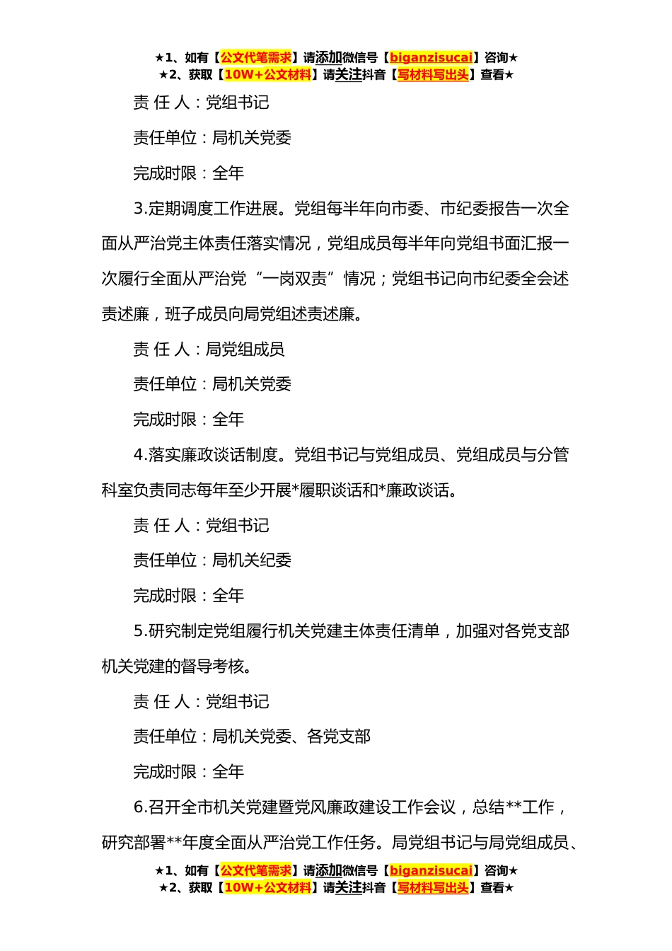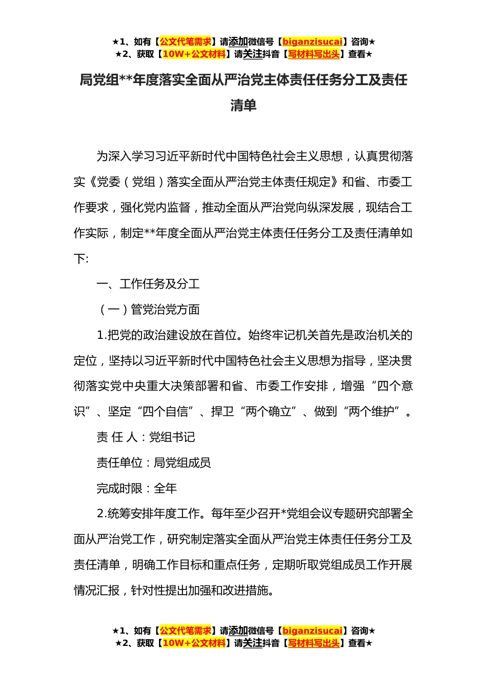 ★1、如有【公文代笔需求】请添加微信号【biganzisucai】咨询★★2、获取【10W+公文材料】请关注抖音【写材料写出头】查看★局党组**年度落实全面从严治党主体责任任务分工及责任清单为深入学习习近平新时代中国特色社会主义思想,认真贯彻落实《党委(党组)落实全面从严治党主体责任规定》和省、市委工作要求,强化党内监督,推动全面从严治党向纵深发展,现结合工作实际,制定**年度全面从严治党主体责任任务分工及责任清单如下:一、工作任务及分工(一)管党治党方面1.把党的政治建设放在首位。始终牢记机关首先是政治机关的定位,坚持以习近平新时代中国特色社会主义思想为指导,坚决贯彻落实党中央重大决策部署和省、市委工作安排,增强“四个意识”、坚定“四个自信”、捍卫“两个确立”、做到“两个维护”...