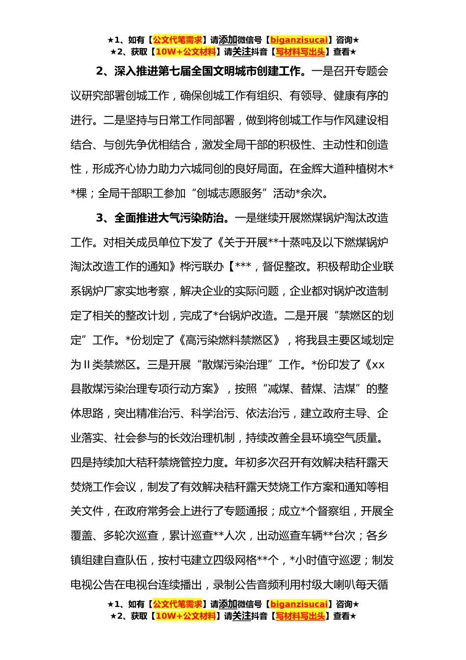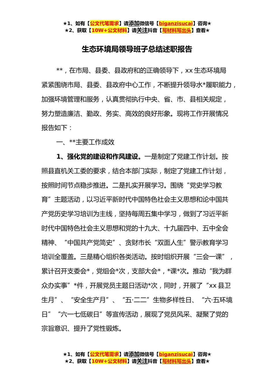★1、如有【公文代笔需求】请添加微信号【biganzisucai】咨询★★2、获取【10W+公文材料】请关注抖音【写材料写出头】查看★生态环境局领导班子总结述职报告**,在市局、县委、县政府和的正确领导下,xx生态环境局紧紧围绕市局、县委、县政府中心工作,不断提升领导水*履职能力,加强环境管理和服务,认真贯彻执行中央、省、市、县相关规定,努力塑造廉洁、勤政、务实、高效的良好形象。现将工作开展情况报告如下:一、**主要工作成效1、强化党的建设和作风建设。一是制定了党建工作计划。按照县直机关工委的要求,结合本部门实际,制定了党建工作计划,按照时间节点稳步推进。二是扎实开展学习。围绕“党史学习教育”主题活动,以习近平新时代中国特色社会主义思想和论中国共产党历史学习培训为主线,坚持每周五...