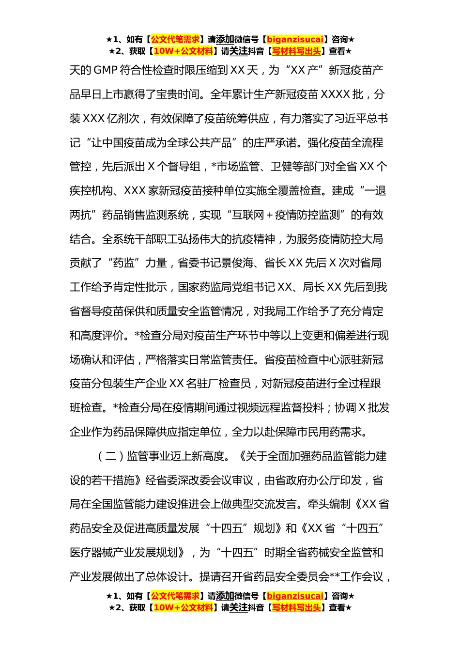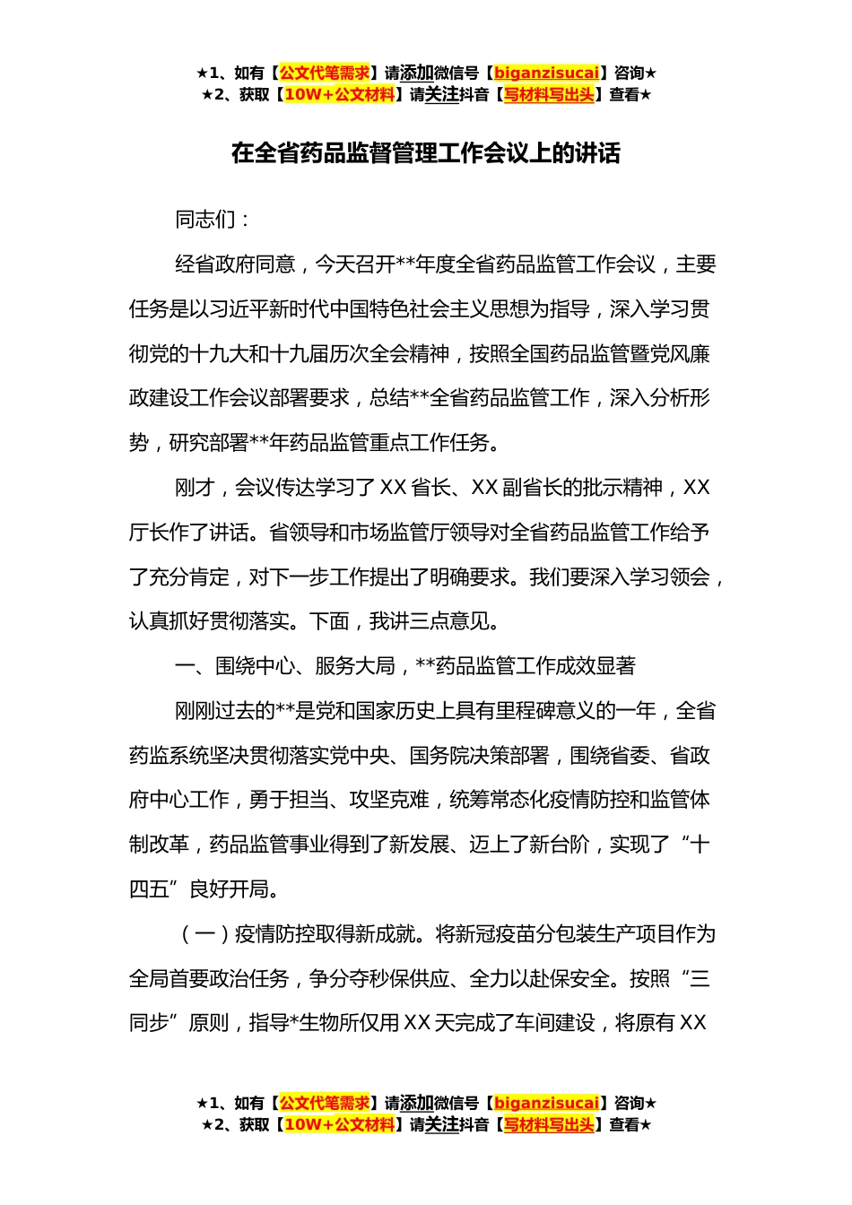 ★1、如有【公文代笔需求】请添加微信号【biganzisucai】咨询★★2、获取【10W+公文材料】请关注抖音【写材料写出头】查看★在全省药品监督管理工作会议上的讲话同志们:经省政府同意,今天召开**年度全省药品监管工作会议,主要任务是以习近平新时代中国特色社会主义思想为指导,深入学习贯彻党的十九大和十九届历次全会精神,按照全国药品监管暨党风廉政建设工作会议部署要求,总结**全省药品监管工作,深入分析形势,研究部署**年药品监管重点工作任务。刚才,会议传达学习了XX省长、XX副省长的批示精神,XX厅长作了讲话。省领导和市场监管厅领导对全省药品监管工作给予了充分肯定,对下一步工作提出了明确要求。我们要深入学习领会,认真抓好贯彻落实。下面,我讲三点意见。一、围绕中心、服务大局,**药品监...